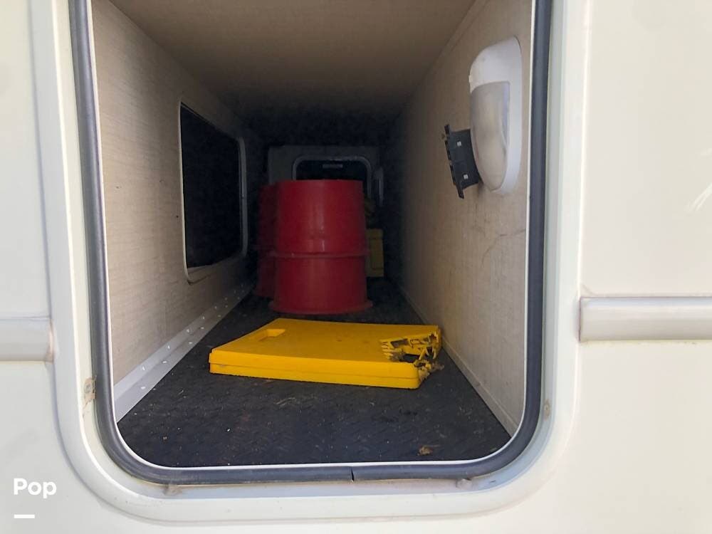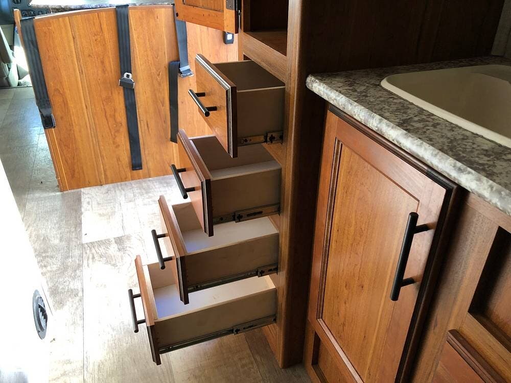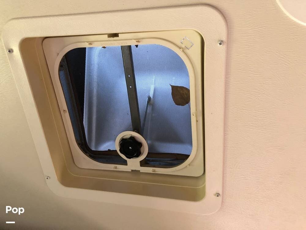 The living space offers comfort with ceiling vents, a water heater, and tinted windows.