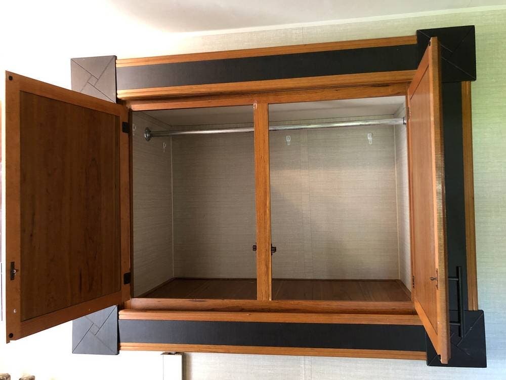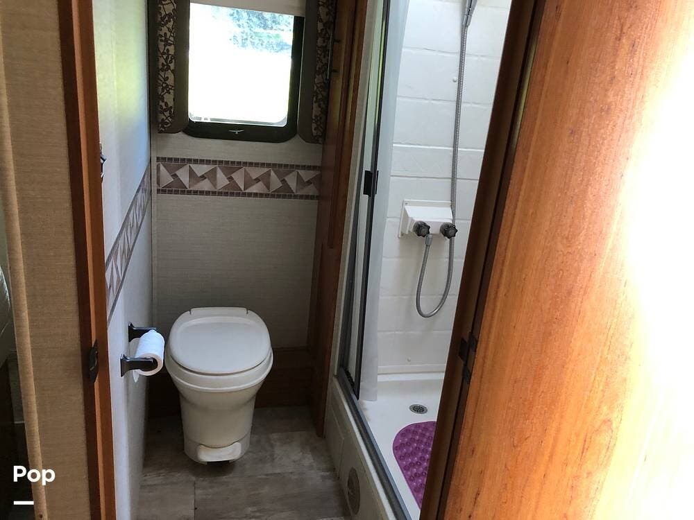 This model includes a full bathroom with a shower, medicine cabinet, and black water flush system.