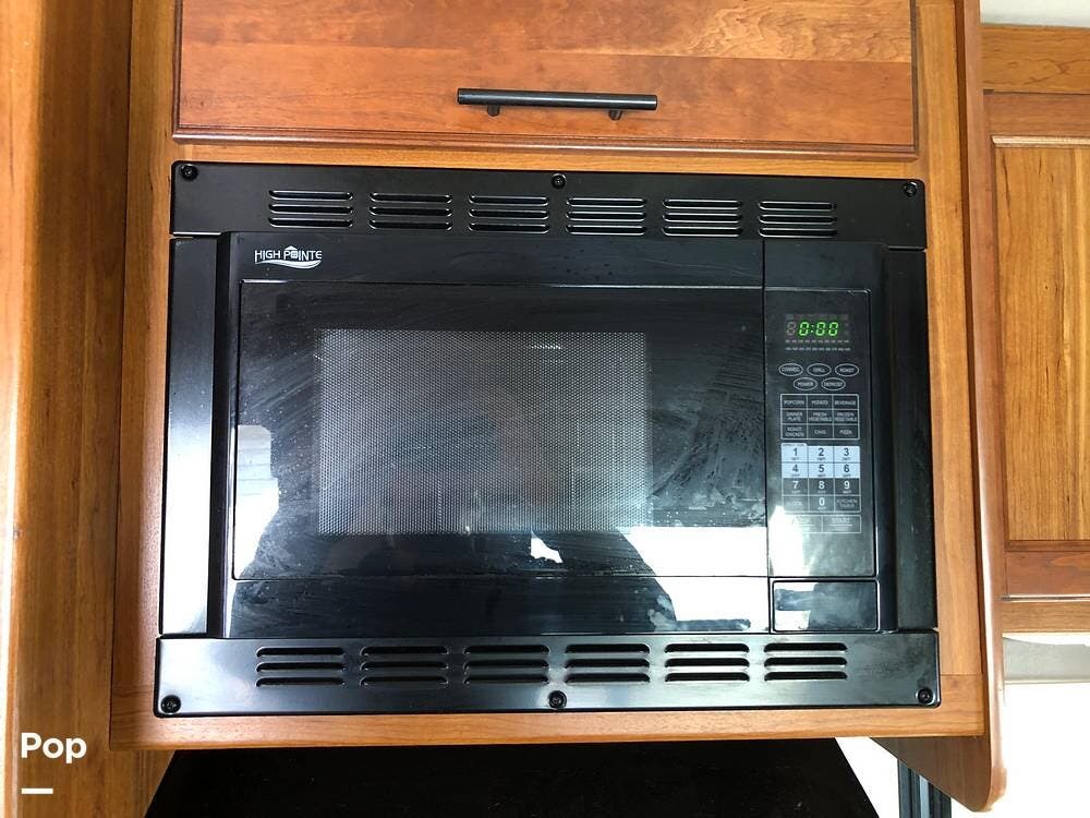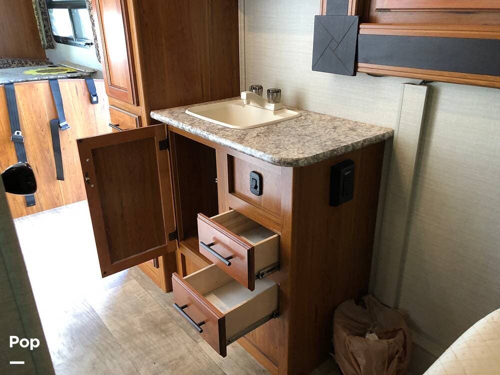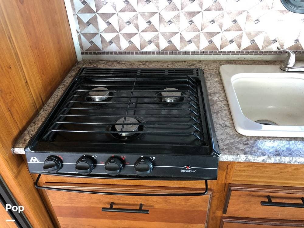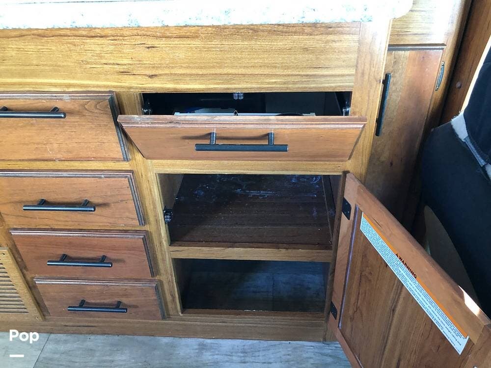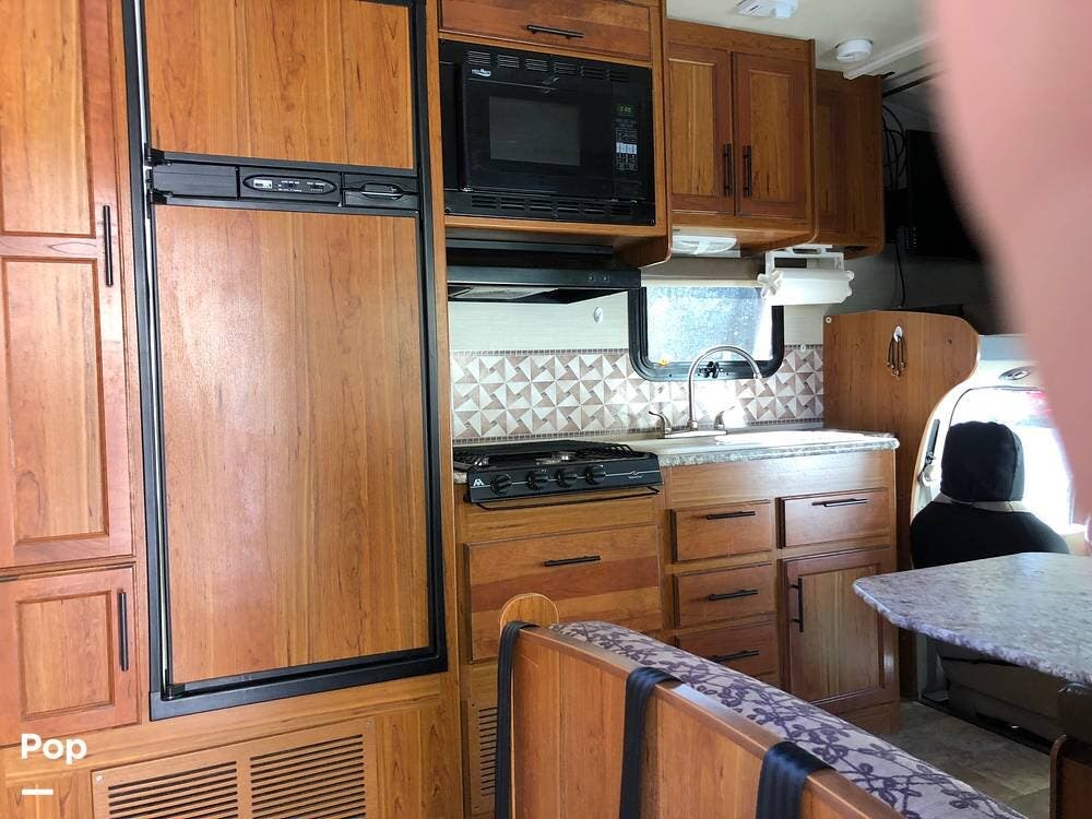 Inside, you'll find a well-equipped kitchen featuring a 3-burner stove, a microwave/convection oven, and a double kitchen sink, along with a pantry and a refrigerator with freezer. The cozy dinette is perfect for meals, and the honey cherry cabinets provide ample storage.