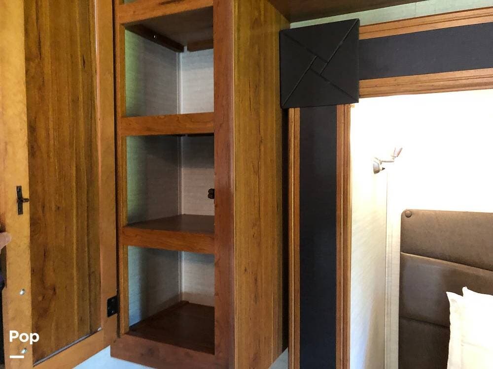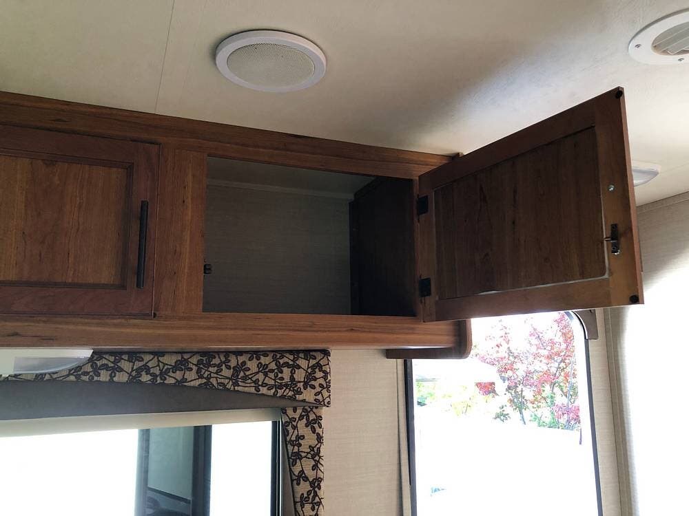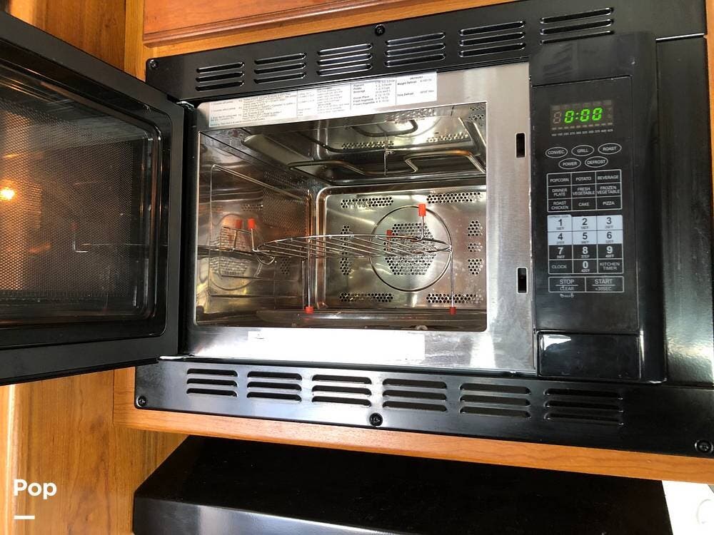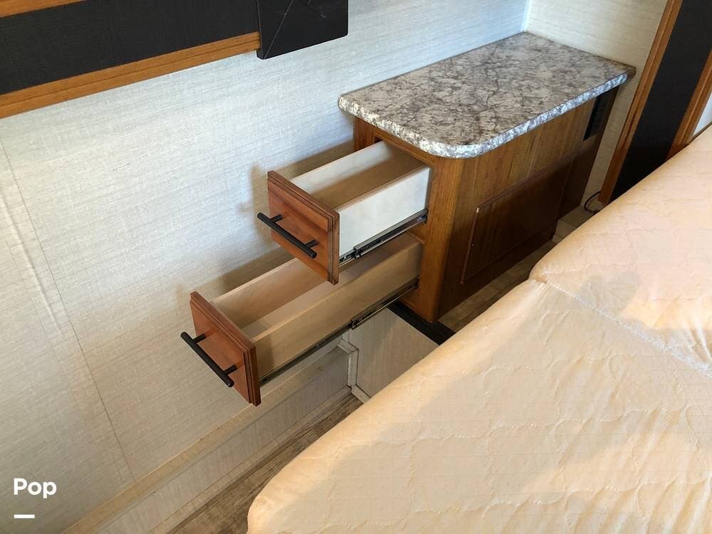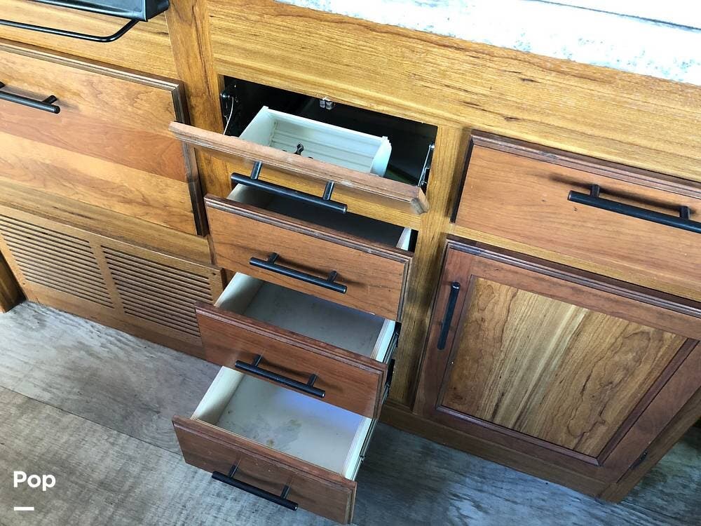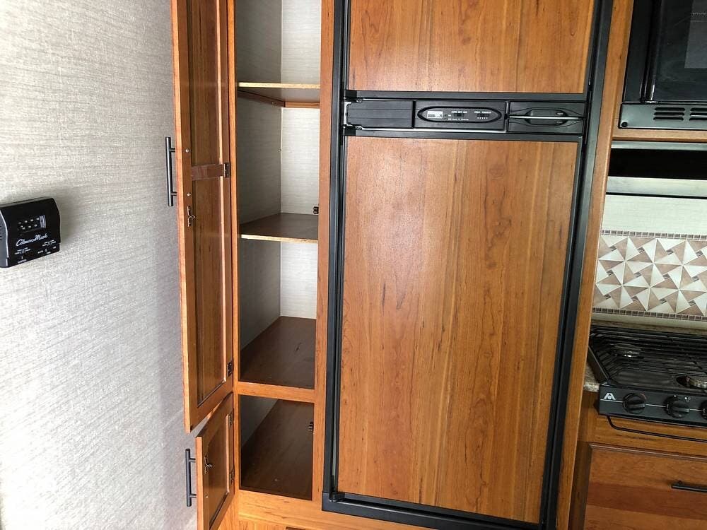 Inside, you'll find a well-equipped kitchen featuring a 3-burner stove, a microwave/convection oven, and a double kitchen sink, along with a pantry and a refrigerator with freezer. The cozy dinette is perfect for meals, and the honey cherry cabinets provide ample storage.