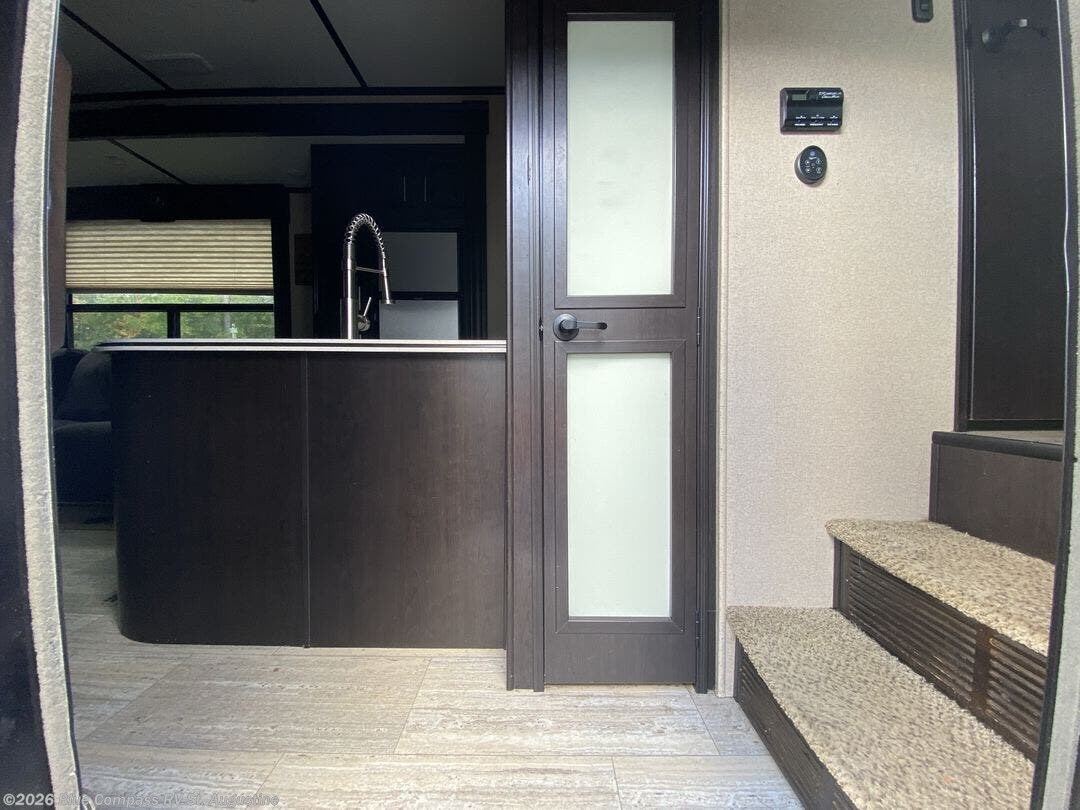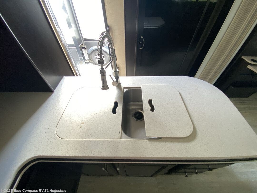 Enter the main living area and find a slide which helps to open up this space. The slide has a sofa with folding backrests, pantry, and 8 cu. ft. refrigerator, or you can choose an optional 12 cu. ft. refrigerator. Adjacent to the slide you will find a three burner range, microwave, overhead cabinet, and L-shaped counter with a double kitchen sink. To the left of the main entry door there is a patio deck which allows you to enjoy the outdoors, but yet be up off the ground. In the corner of the living area you will find an entertainment center with a 50" TV.