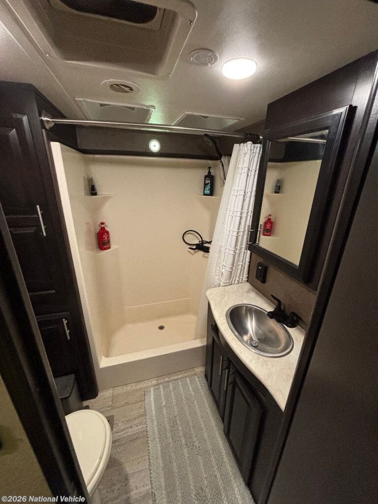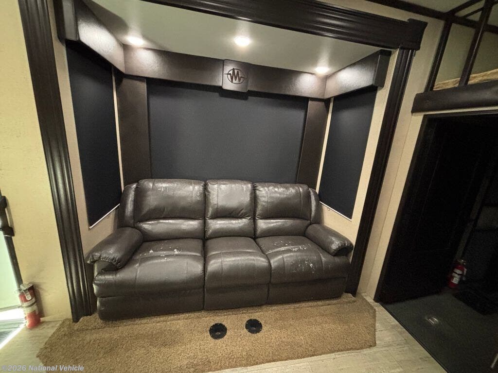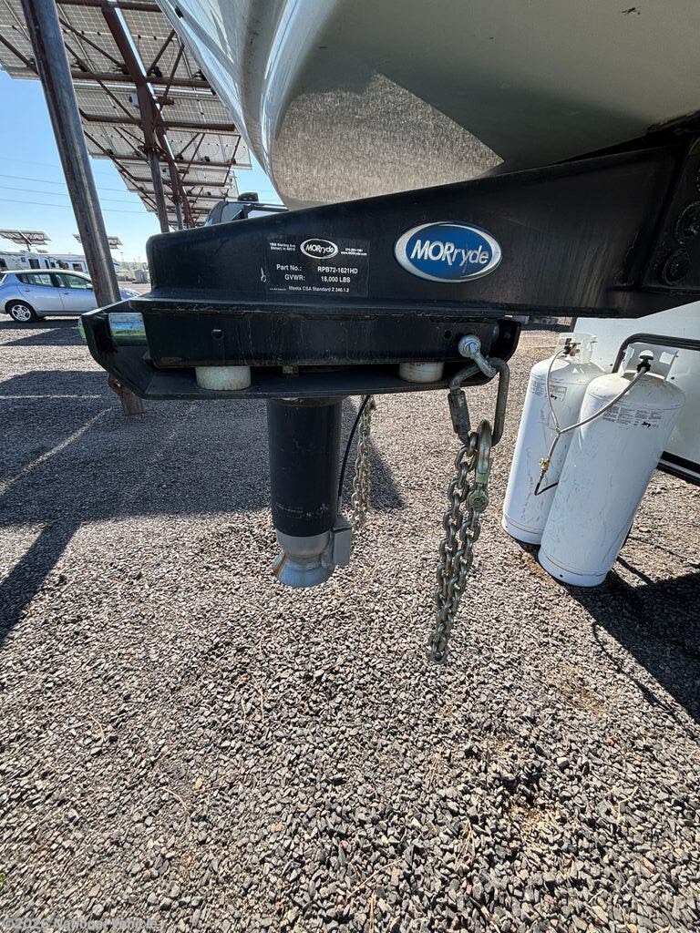 Inside, you?ll find a residential-style interior with Corian countertops, stainless appliances, and upgraded fixtures in both the kitchen and bathrooms. The living area includes theatre seating with heat, massage, cupholders, and LED accent lighting, along with a fireplace and smart TV, creating a comfortable space to relax after a long day. The pedestal dining table adds flexibility for meals or workspace.