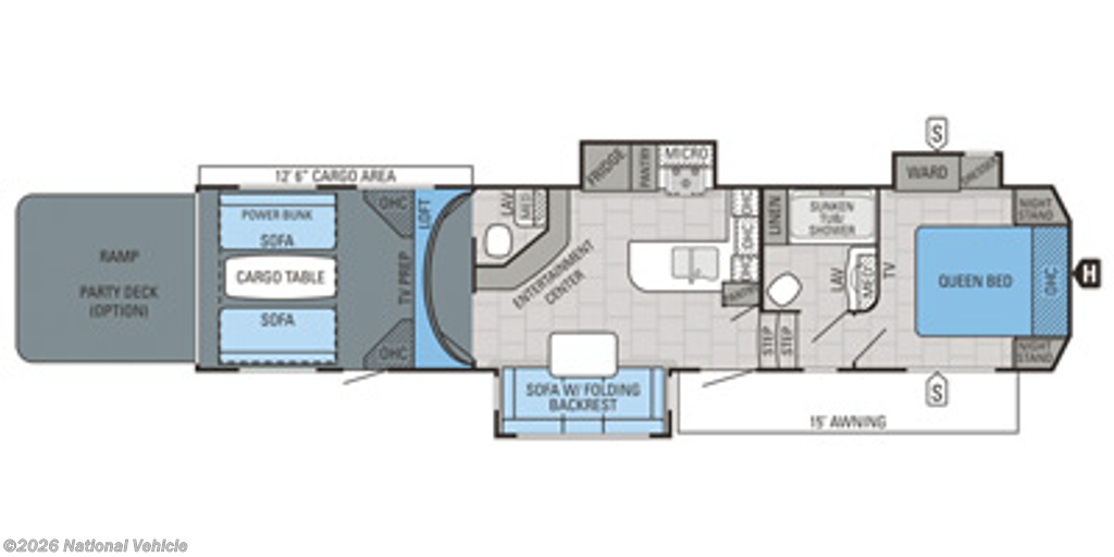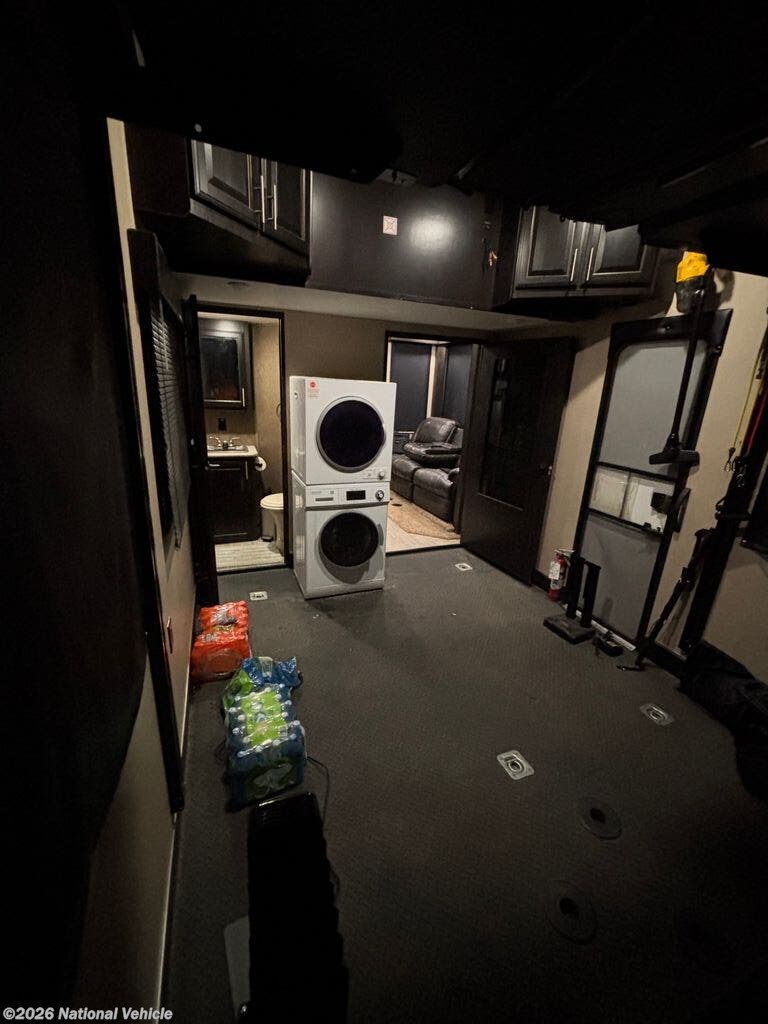 The garage area (12?6?) is extremely versatile, featuring a rear queen bed (top bunk) and a convertible lower bed/sofa setup, plus washer/dryer hookups. The rear ramp door converts into a patio deck with canopy and railings, giving you an elevated outdoor living space?perfect for entertaining or relaxing at camp.
