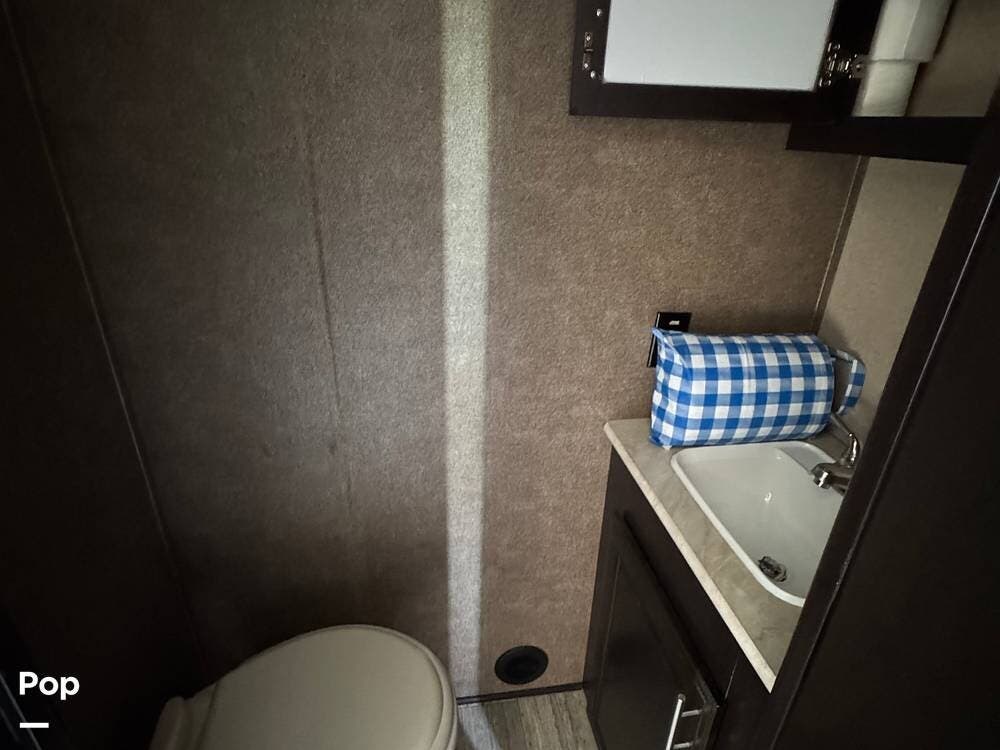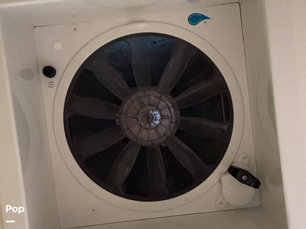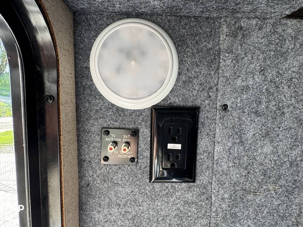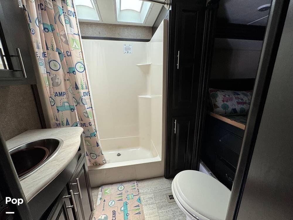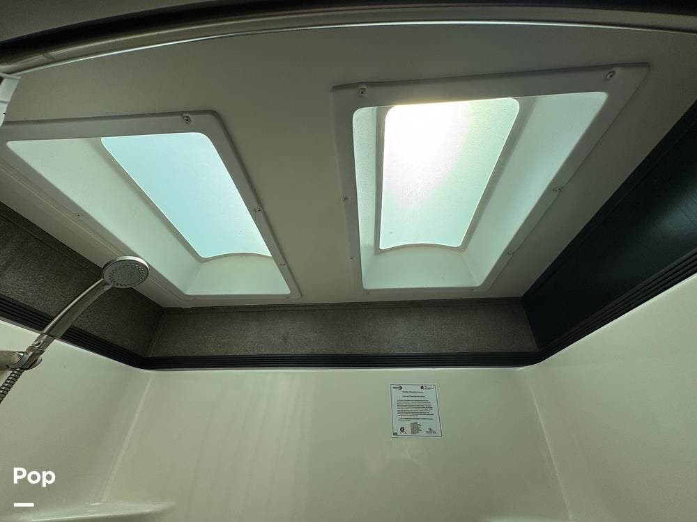 The bathroom features an electric vent with an added vent cover protector. It also has a skylight above the bathtub and a 10-gal capacity Atwood water heater (dual electric and gas).