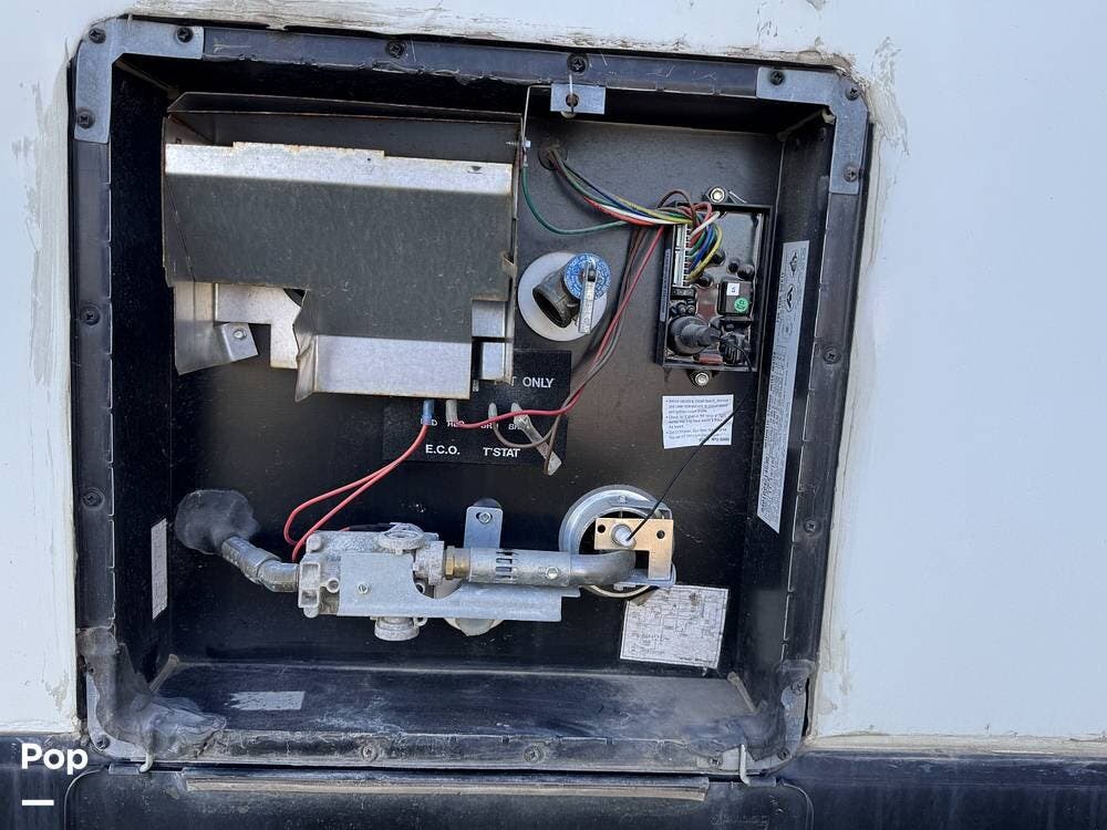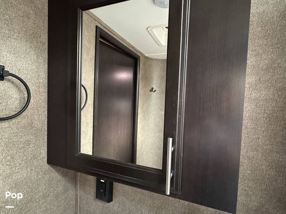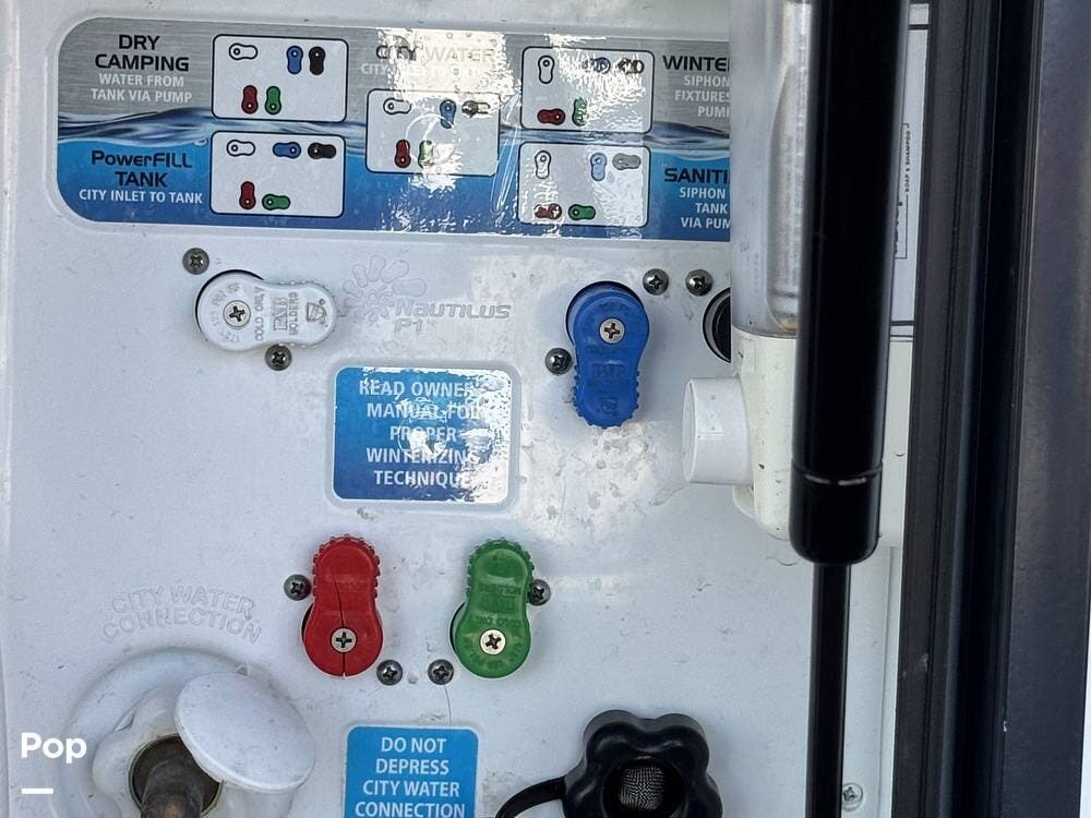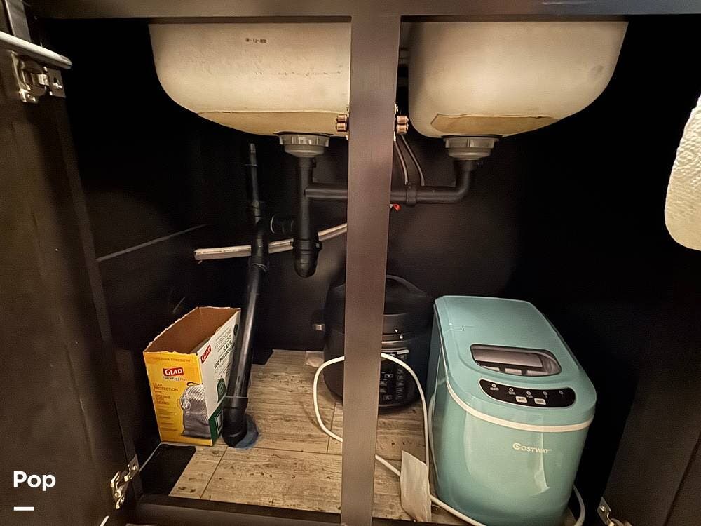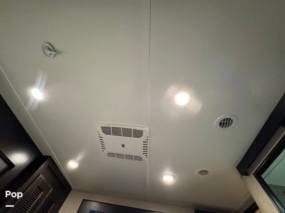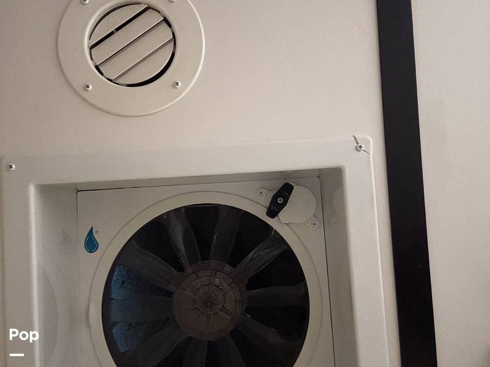 The bathroom features an electric vent with an added vent cover protector. It also has a skylight above the bathtub and a 10-gal capacity Atwood water heater (dual electric and gas).