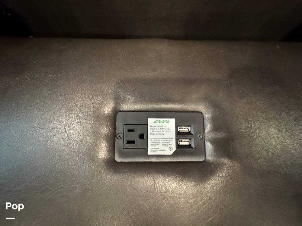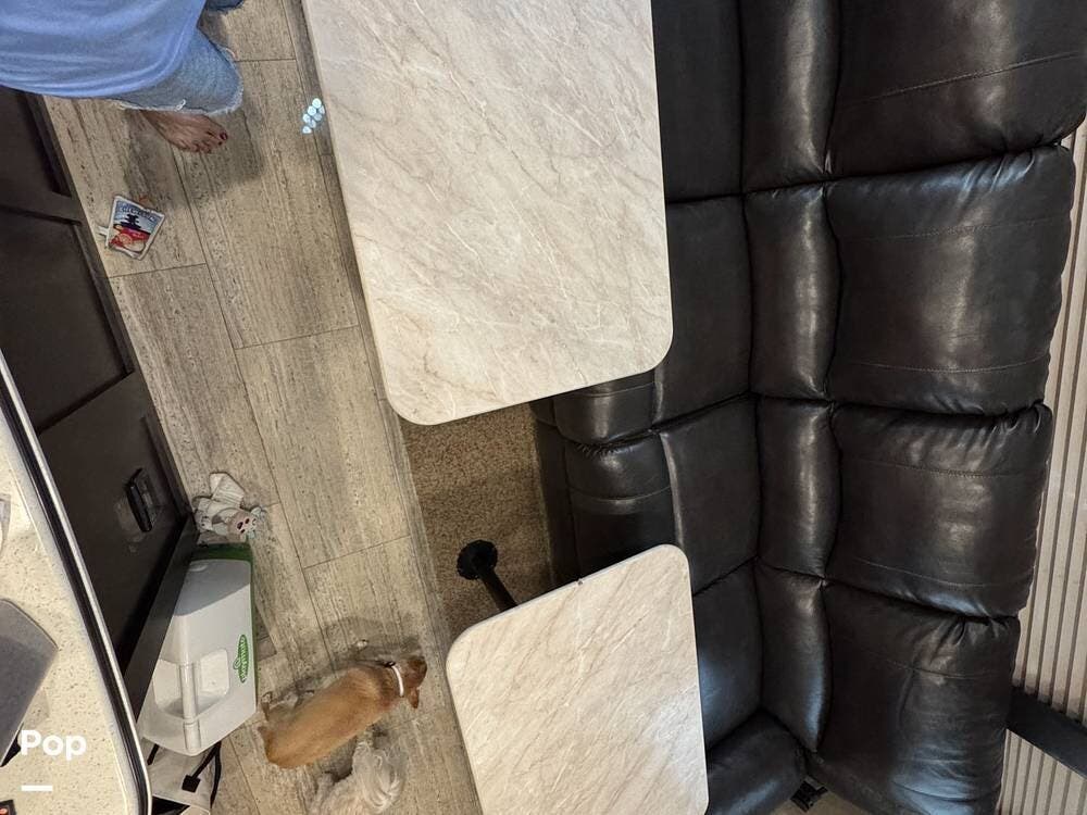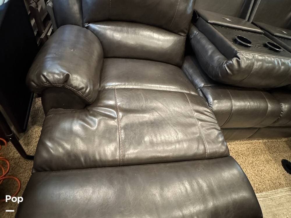 Furnishings include a four-cushion 84" couch with end recliners plus heat & massage, a TCL 4K 50" smart TV, a Furrion DVD Player with radio/bluetooth/aux, a stereo system that can play music on outside speakers, and a second Furrion DVD player with radio in the garage with a 29" TCL smart TV!