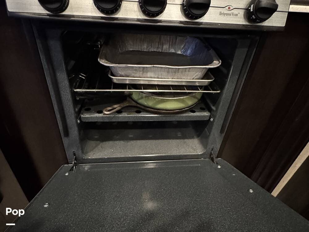 It features a residential-style kitchen with a 12 ft cubic Norcold refrigerator, Atwood oven, stove, over-range hood with fan and light, a high-point microwave, double stainless sinks, and solid surface counters with backsplashes.