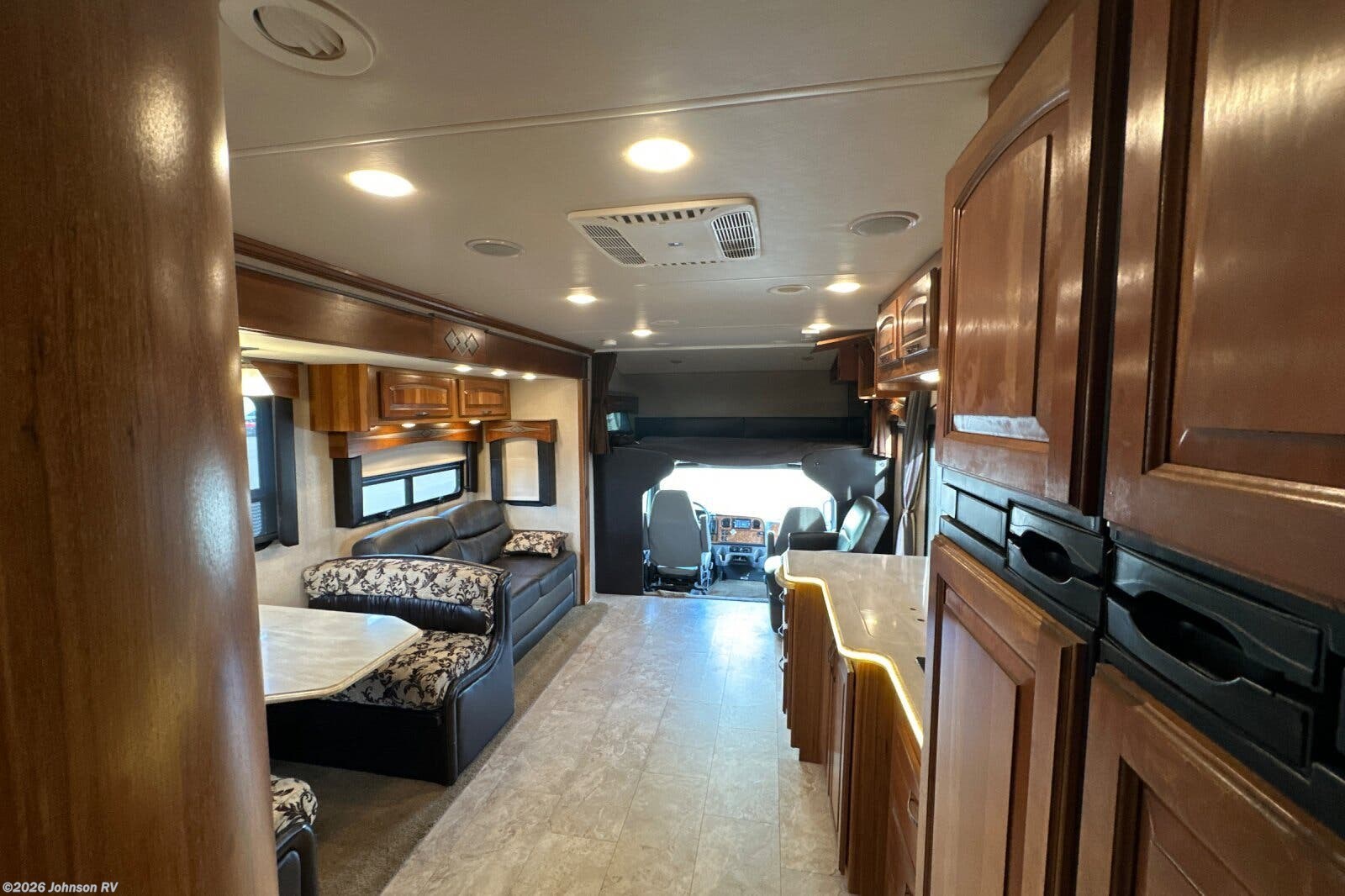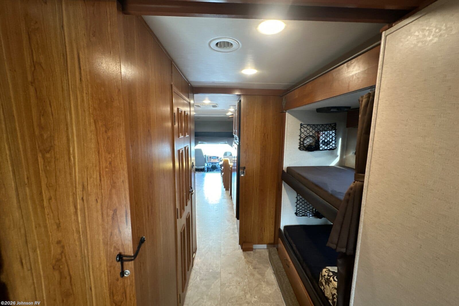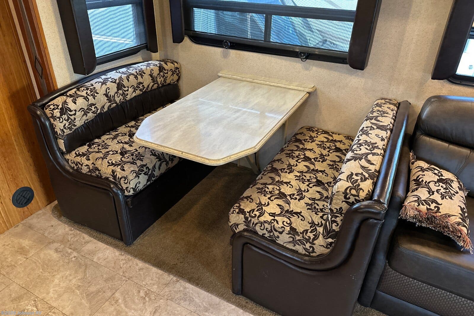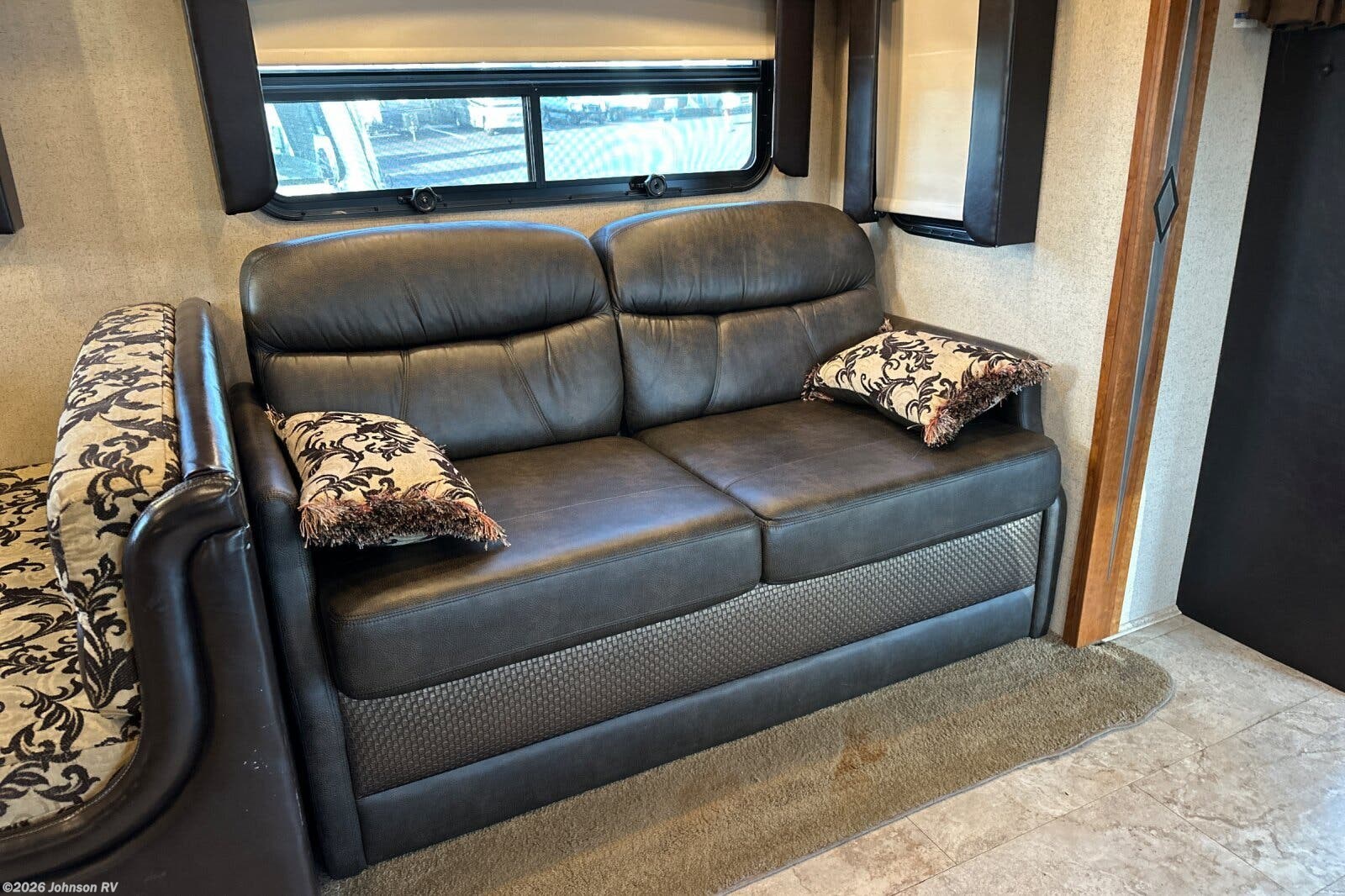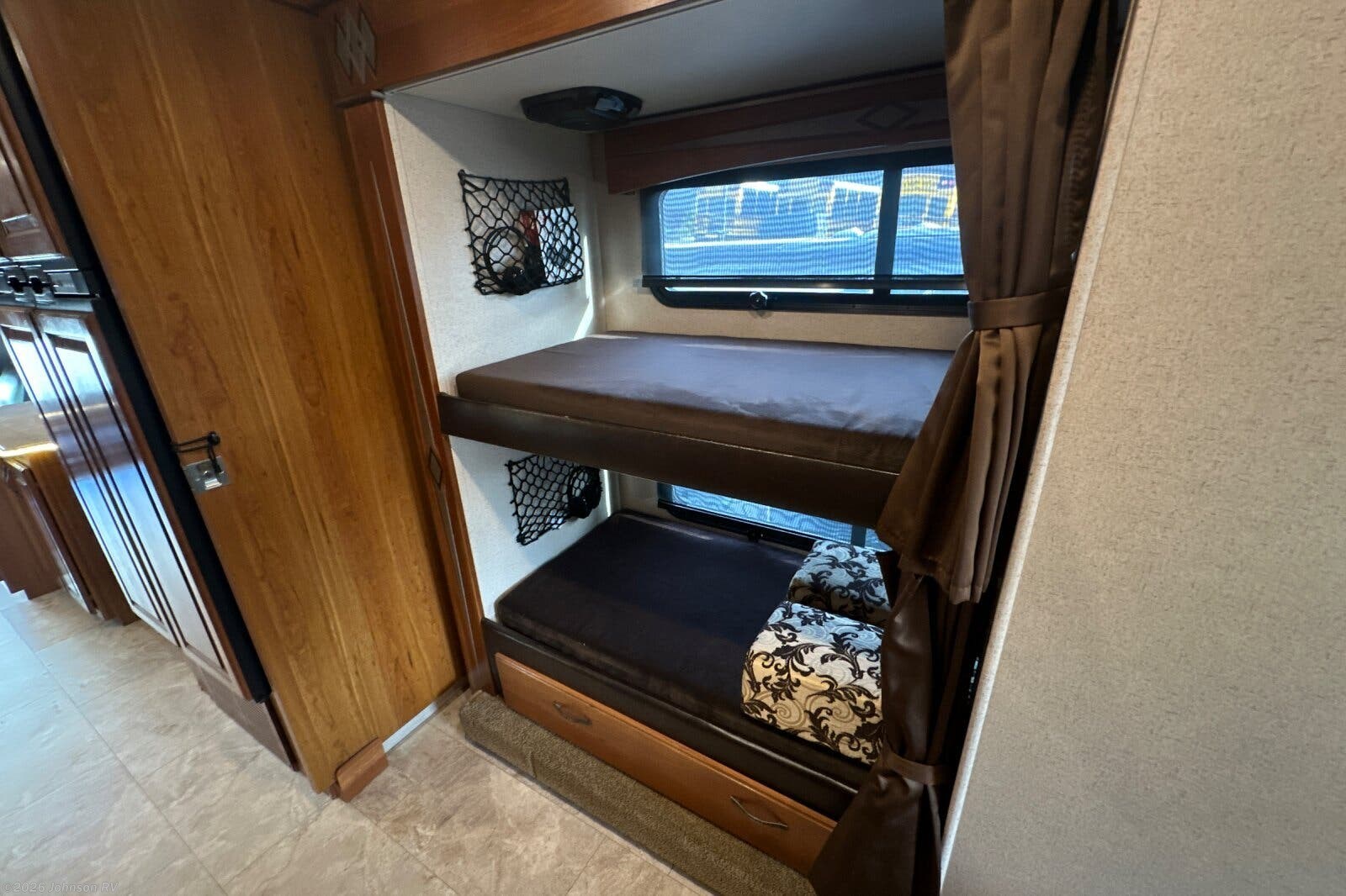 The 2016 Jayco Seneca 37FS is a robust Super C motorhome that blends residential luxury with the durability of a Freightliner M2 chassis. Powered by a 6.7L Cummins ISB diesel engine delivering 340 horsepower and 660 lb-ft of torque, this RV is built for long-haul comfort and towing confidence, with a 10,000-pound hitch rating and a 74-gallon fuel tank. Measuring 38.8 feet in length, the 37FS features two slide-outs that expand the living space, accommodating up to 10 people. The floorplan includes a rear king bed, a set of bunk beds, a cab-over queen bed, a hide-a-bed sofa, and a convertible dinette. The mid-coach bathroom offers a corner shower, porcelain toilet, and ample storage. The kitchen is equipped with a full-size 12 cu. ft. refrigerator with ice maker, convection microwave, two-burner cooktop, and solid-surface countertops. Entertainment options include three TVs (including an exterior entertainment center), surround sound, and a touch-screen infotainment system with GPS.