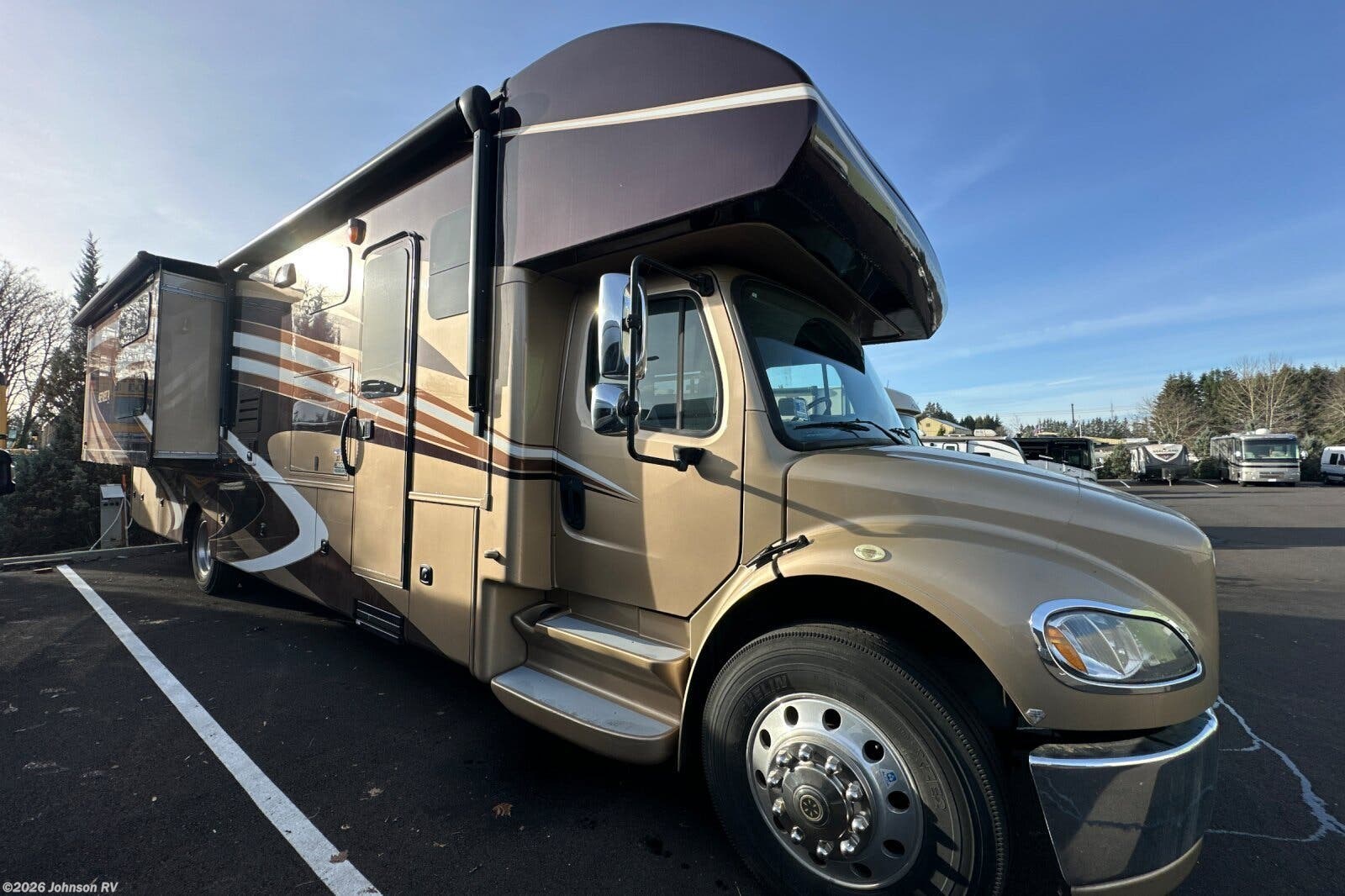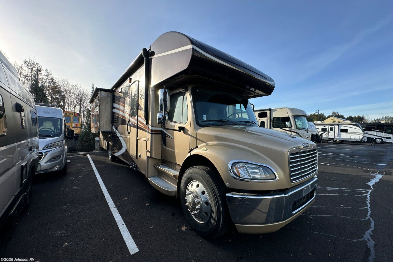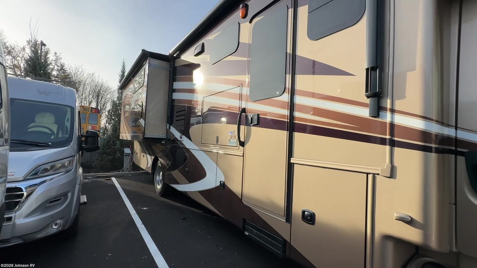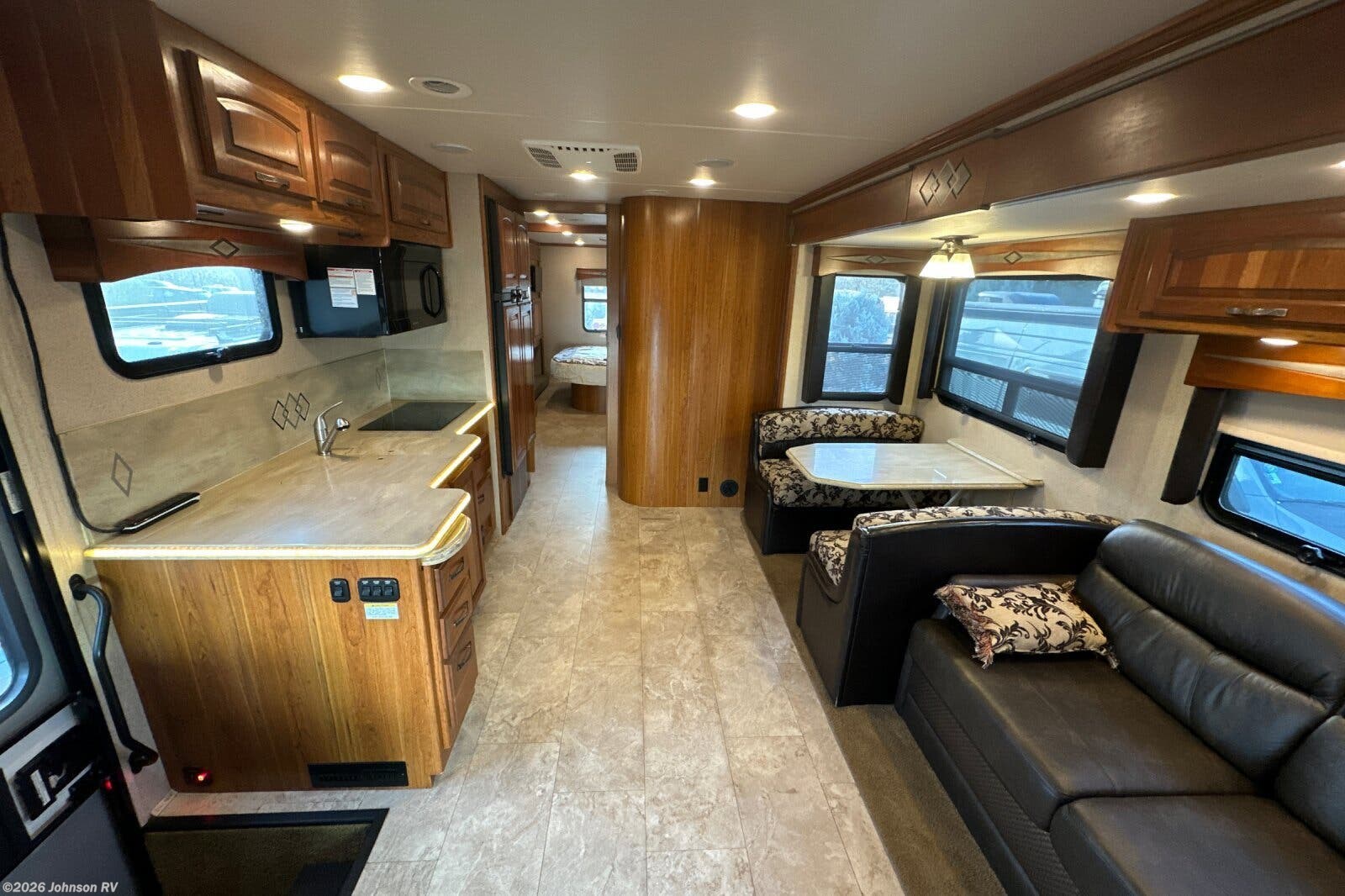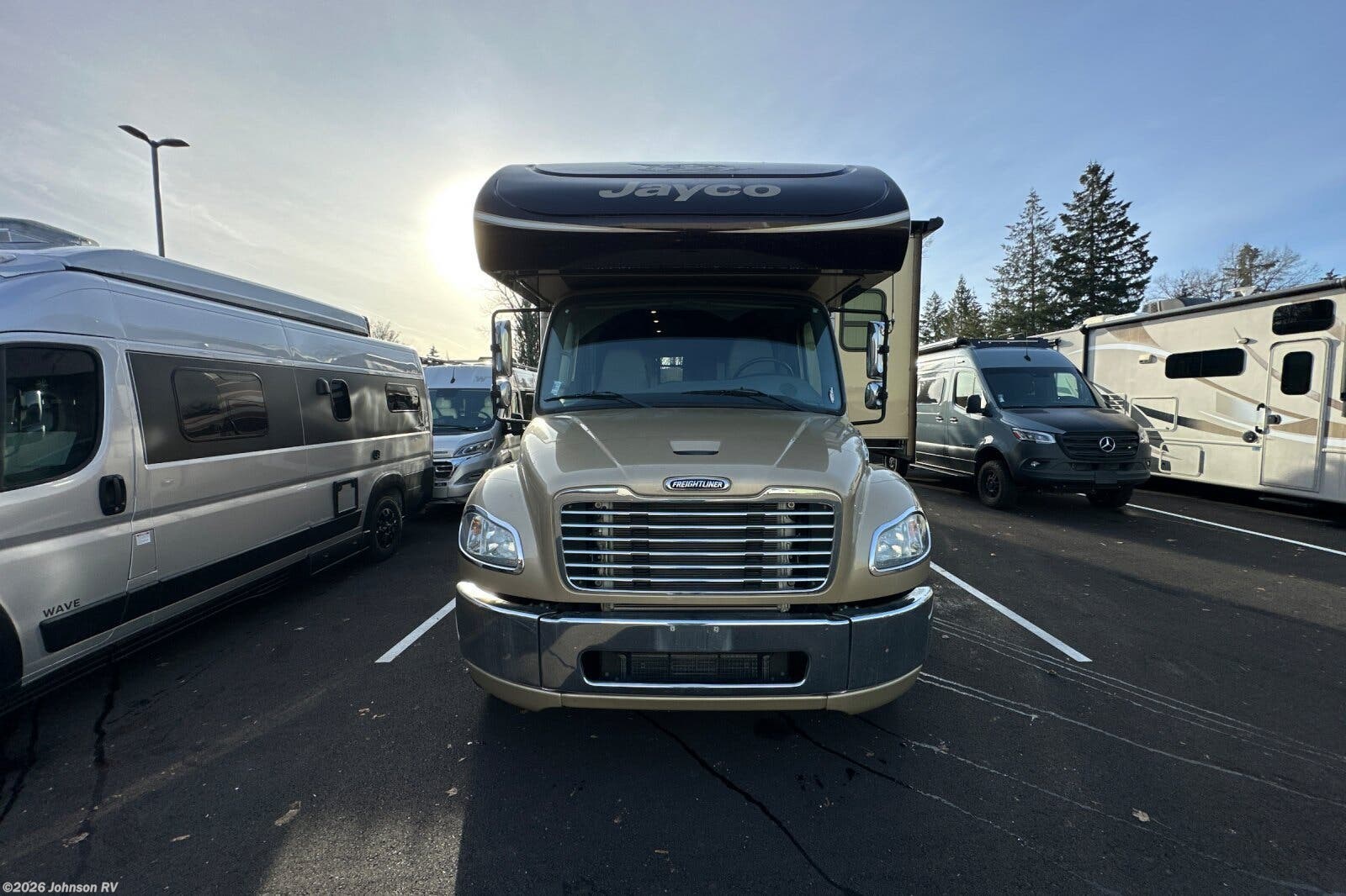 The 2016 Jayco Seneca 37FS is a robust Super C motorhome that blends residential luxury with the durability of a Freightliner M2 chassis. Powered by a 6.7L Cummins ISB diesel engine delivering 340 horsepower and 660 lb-ft of torque, this RV is built for long-haul comfort and towing confidence, with a 10,000-pound hitch rating and a 74-gallon fuel tank. Measuring 38.8 feet in length, the 37FS features two slide-outs that expand the living space, accommodating up to 10 people. The floorplan includes a rear king bed, a set of bunk beds, a cab-over queen bed, a hide-a-bed sofa, and a convertible dinette. The mid-coach bathroom offers a corner shower, porcelain toilet, and ample storage. The kitchen is equipped with a full-size 12 cu. ft. refrigerator with ice maker, convection microwave, two-burner cooktop, and solid-surface countertops. Entertainment options include three TVs (including an exterior entertainment center), surround sound, and a touch-screen infotainment system with GPS.