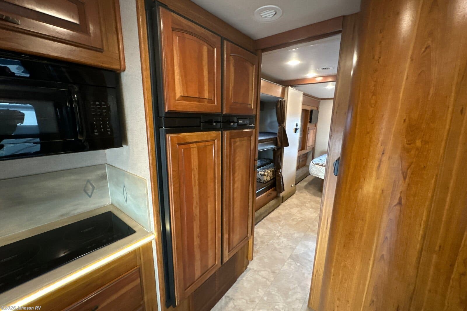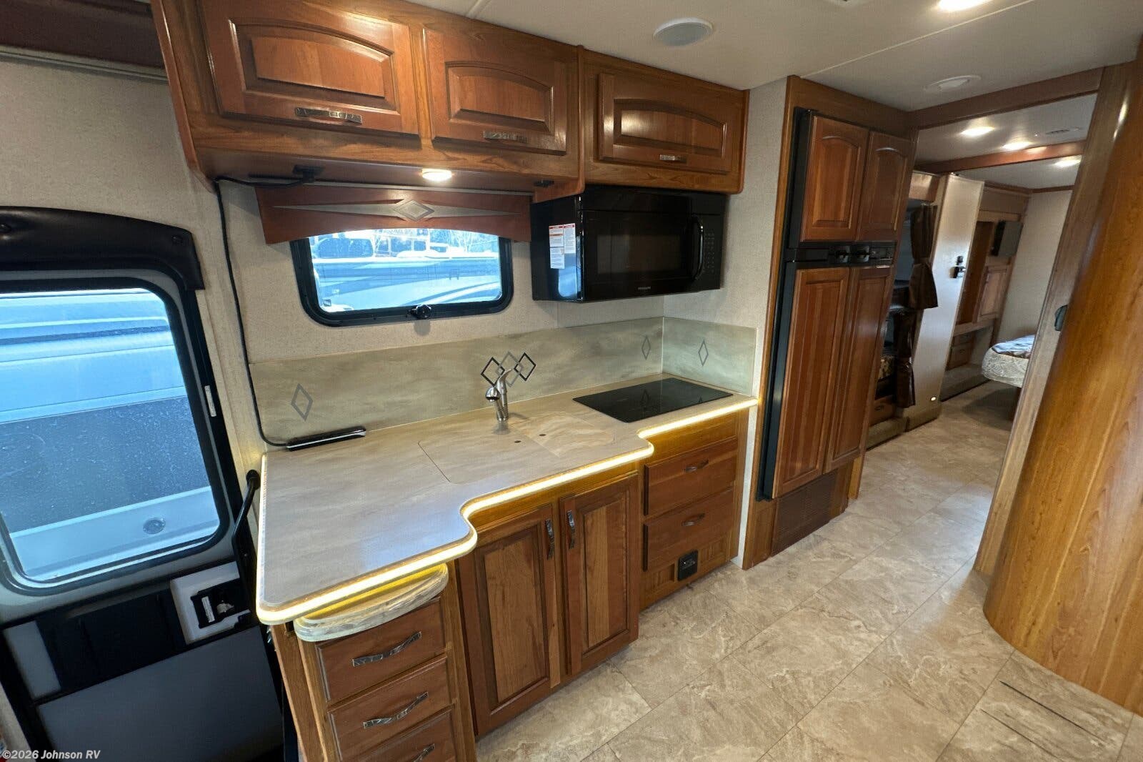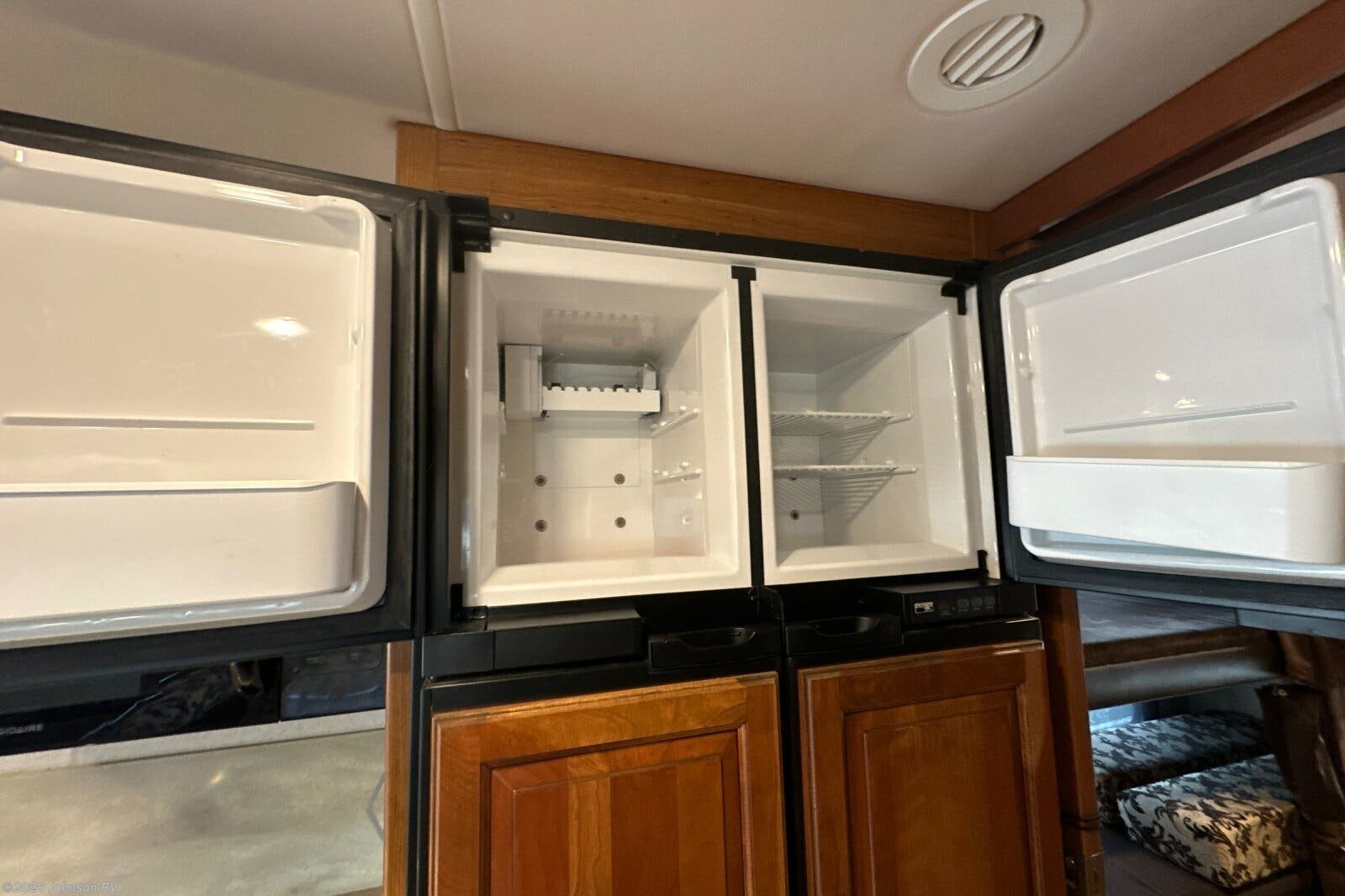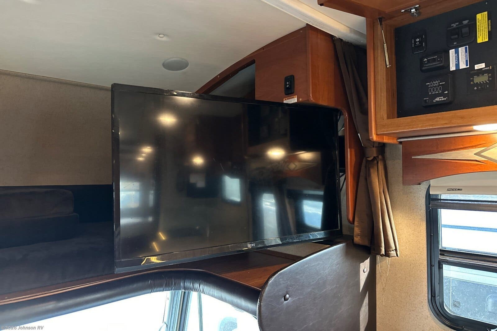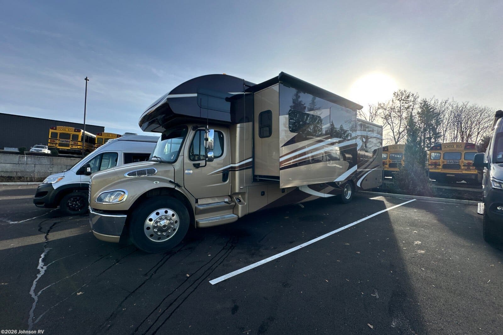 The 2016 Jayco Seneca 37FS is a robust Super C motorhome that blends residential luxury with the durability of a Freightliner M2 chassis. Powered by a 6.7L Cummins ISB diesel engine delivering 340 horsepower and 660 lb-ft of torque, this RV is built for long-haul comfort and towing confidence, with a 10,000-pound hitch rating and a 74-gallon fuel tank. Measuring 38.8 feet in length, the 37FS features two slide-outs that expand the living space, accommodating up to 10 people. The floorplan includes a rear king bed, a set of bunk beds, a cab-over queen bed, a hide-a-bed sofa, and a convertible dinette. The mid-coach bathroom offers a corner shower, porcelain toilet, and ample storage. The kitchen is equipped with a full-size 12 cu. ft. refrigerator with ice maker, convection microwave, two-burner cooktop, and solid-surface countertops. Entertainment options include three TVs (including an exterior entertainment center), surround sound, and a touch-screen infotainment system with GPS.