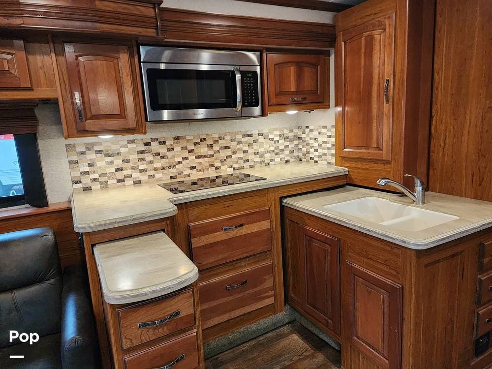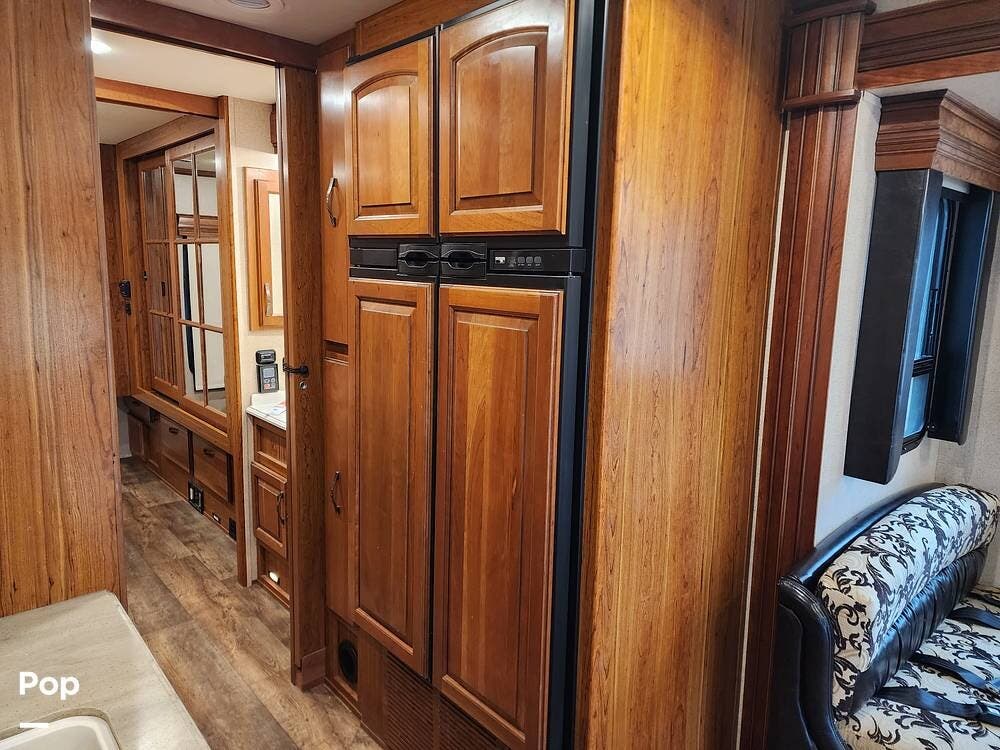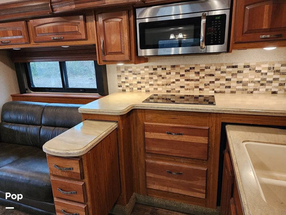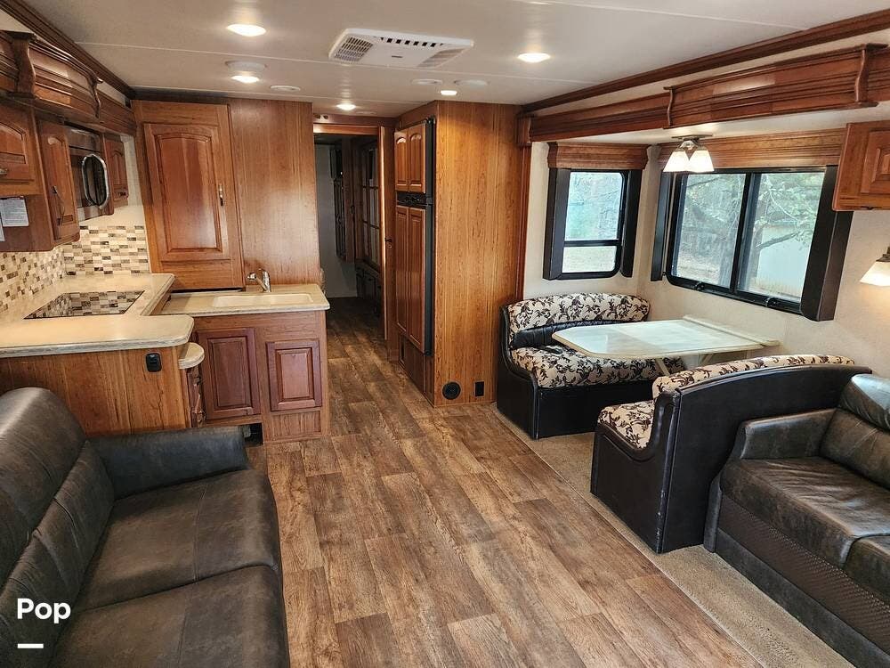 The interior has three side slide-outs that give you a roomy residential atmosphere, sleeps up to 6, Dual A/C units and central heating, a residential-style kitchen, with ample cabinetry space, solid-surface countertops, a large refrigerator, a dinette, sofa seating, and an upgraded entertainment system, which makes this living area a great place to entertain or lounge around.