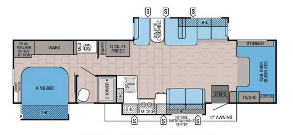Let's not forget about that outside 17' Electric Awning for lounging outside under the shade, along with the exterior TV!