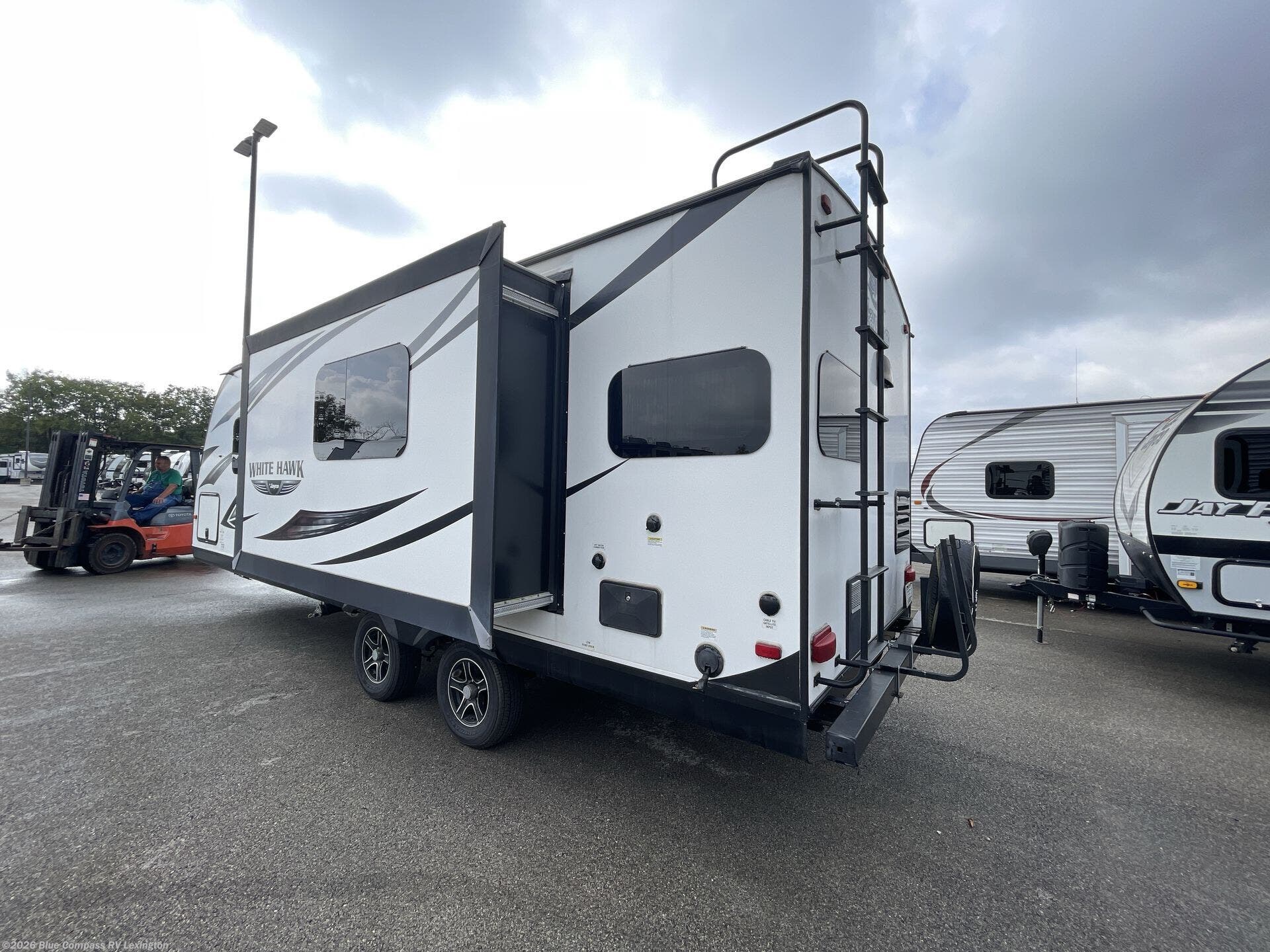 The White Hawk 24RKS travel trailer by Jayco features a rear kitchen layout, a single slide along the road side, and a front bedroom.