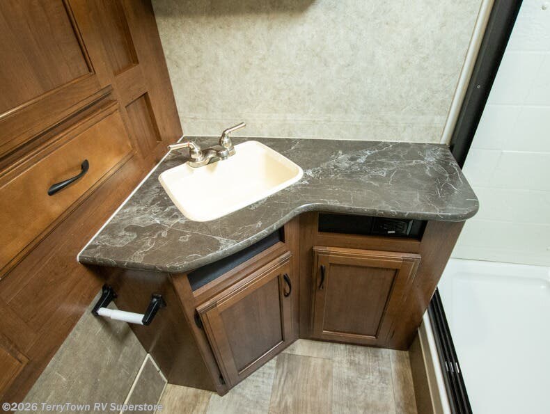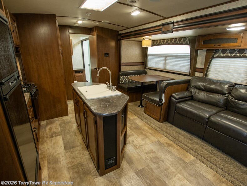 The kitchen/living area has two slides which help to open up the floor space. One slide has a refrigerator, three burner range, and a microwave. Adjacent to the slide there is a large pantry and a smaller pantry for your dry goods. The slide on the opposite side of the trailer has a booth dinette or you can choose an optional free-standing table and chairs, and a hide-a-bed sofa with overhead cabinets. In the middle of the space you will find a kitchen island with a sink, and extra counter space for food prep.
