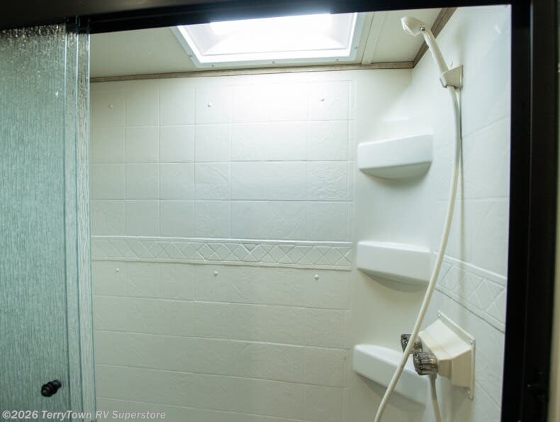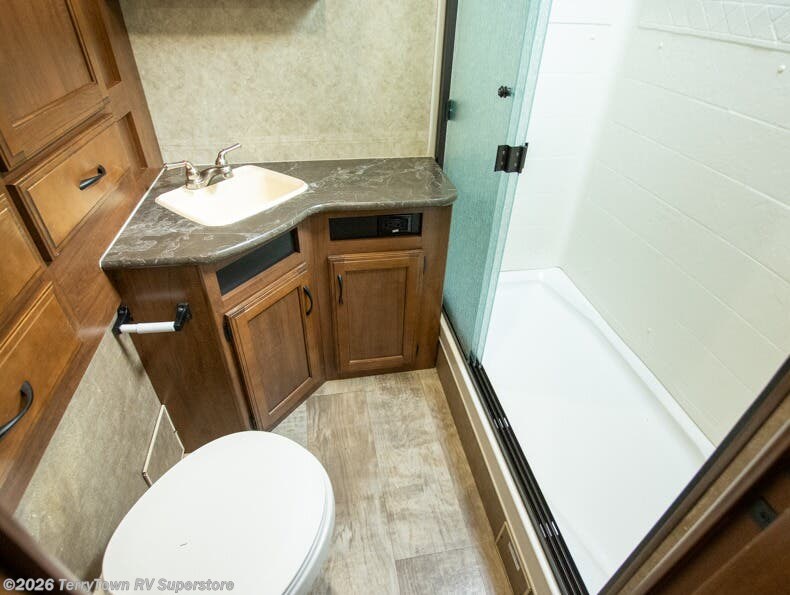 Heading back the rear of the trailer you will find linen storage outside the bathroom door. Inside the bathroom there is a toilet, shower, sink, medicine cabinet, and a wardrobe.