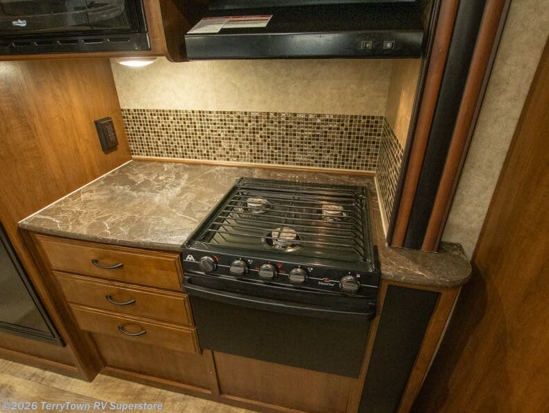 Outside there is an exterior kitchen with a refrigerator, counter space, and pull-out two burner cook-top. The 15' awning provides shade from the sun, and the exterior storage provides space for all of your outdoor camping gear.
