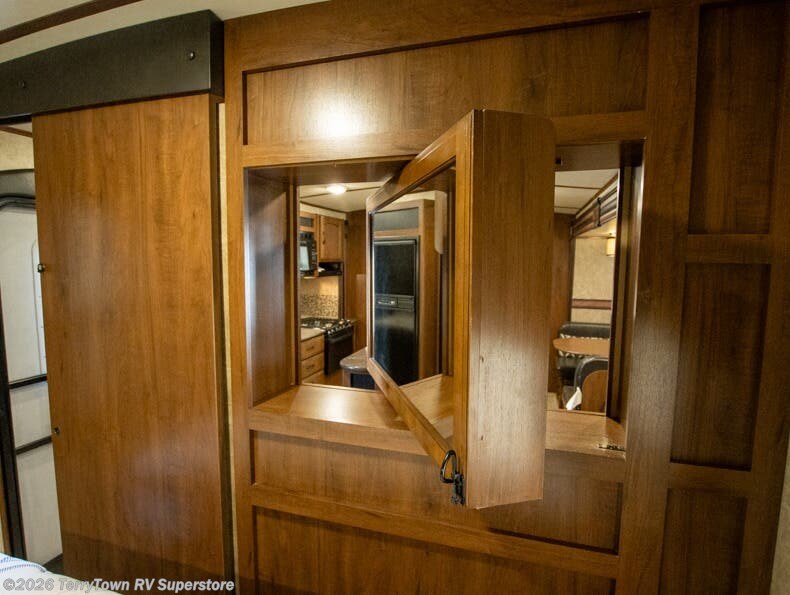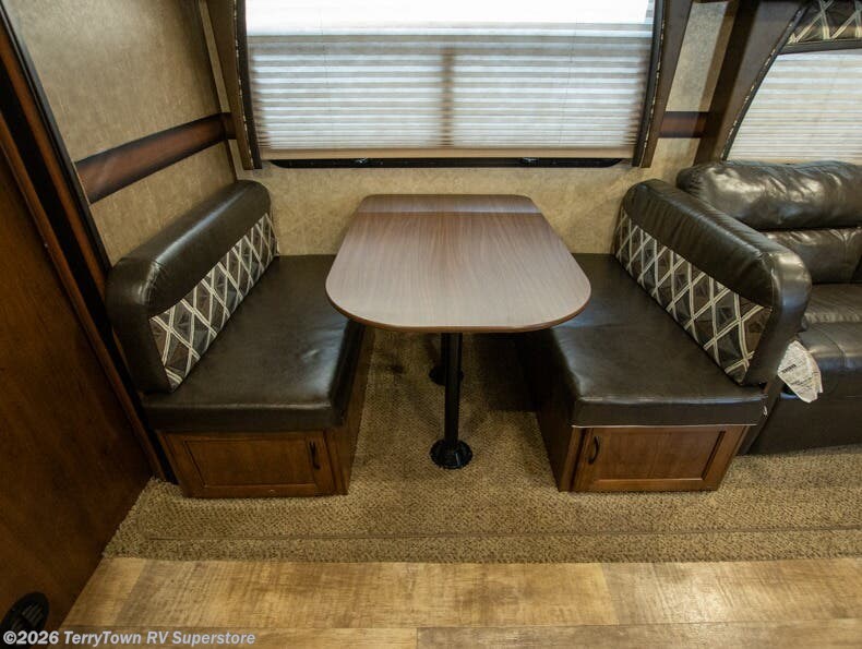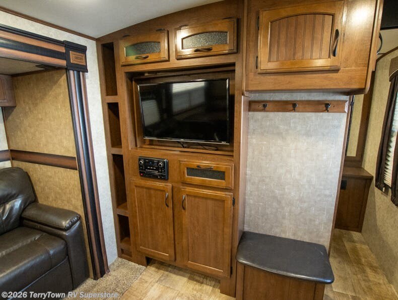 As you step inside the trailer, straight in front of you there is a bench seat with storage, and an overhead cabinet. Next to the bench you will enjoy watching TV or movies on the entertainment center anywhere in the living and kitchen combined space.