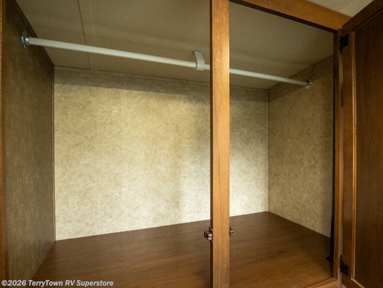 The private front bedroom has a queen bed with wardrobes on either side of the bed and an overhead cabinet above the head of the bed.