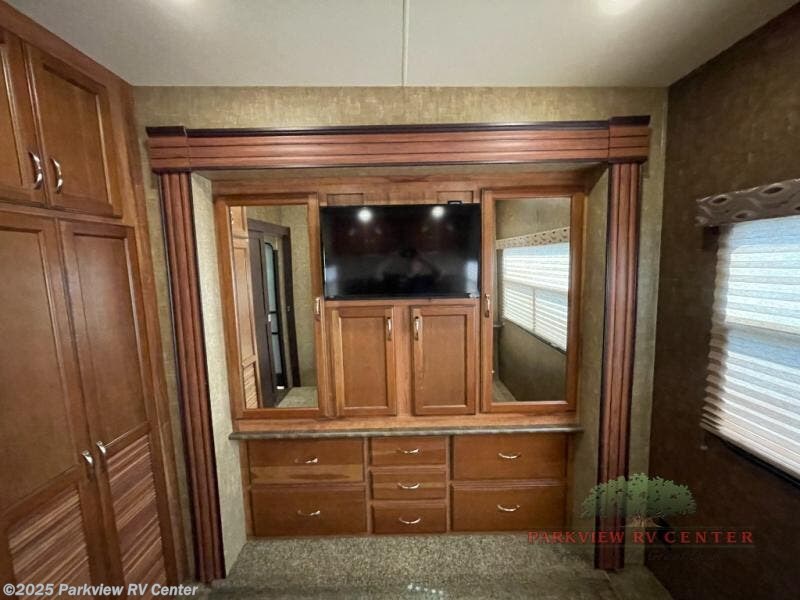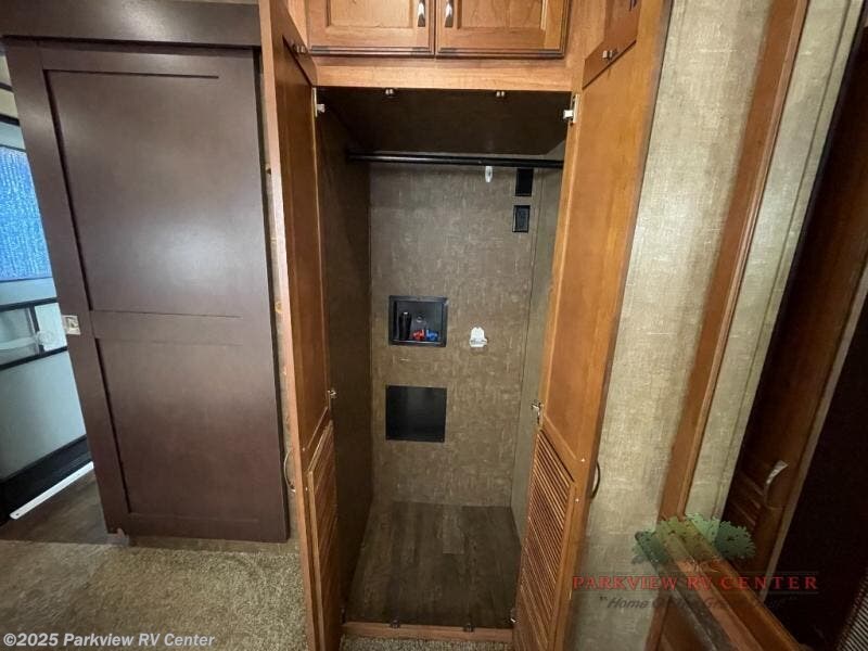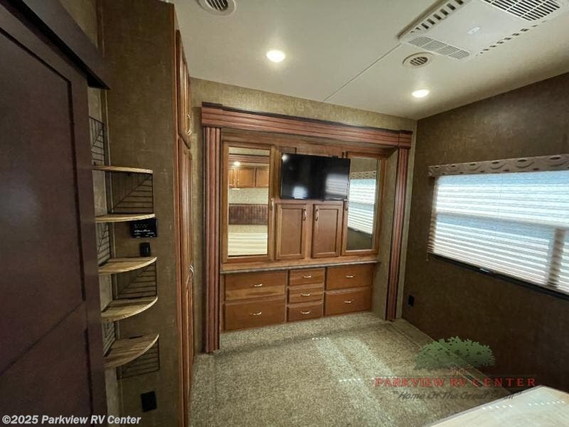 In the rear bedroom you will find a slide with a king bed or you can choose an optional queen bed. Across from the bed there is a slide with a wardrobe and TV. The bedroom is also washer/dryer prepped for your convenience.