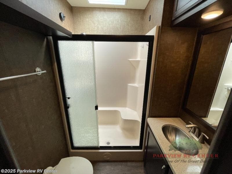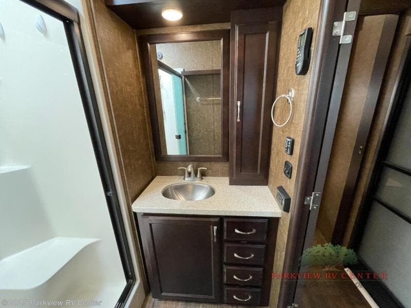 As you proceed toward the rear of the fifth wheel the bathroom is on the left. Inside the bathroom there is a toilet, 48" shower with seat, sink, and medicine cabinet.