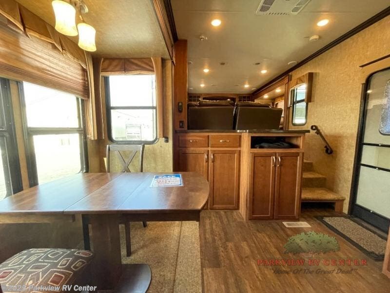 As you enter the fifth wheel, along the left side there is a pull out trash can, three burner range, and double kitchen sink. On the opposite side of the fifth wheel you will find a slide with a refrigerator and a table and chairs. Adjacent to the slide there is a large countertop with charging station.