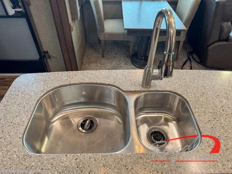 On the opposite side you will find a tri-fold sofa sleeper, 12 cu. ft. refrigerator, and three burner range slide out. There is also a corner counter area off to the side with curio cabinets above. Next to the curio you'll find a closet where you can easily store jackets. The kitchen island is where the double kitchen sink is located, and it provides a bit more counter space on either side.