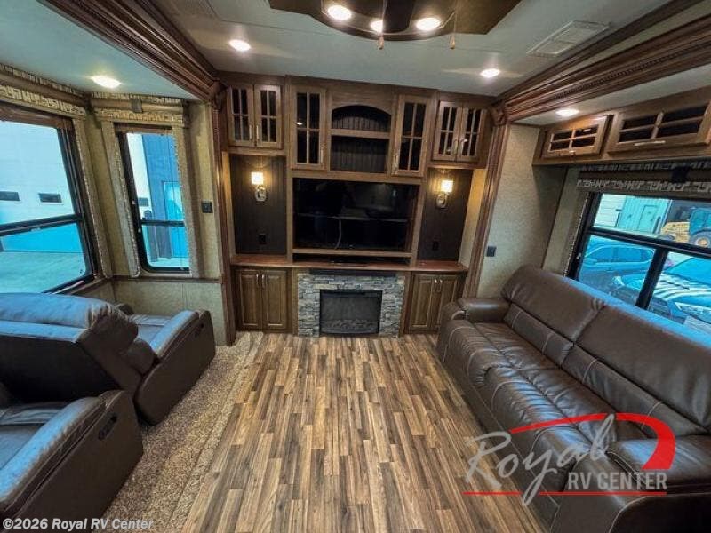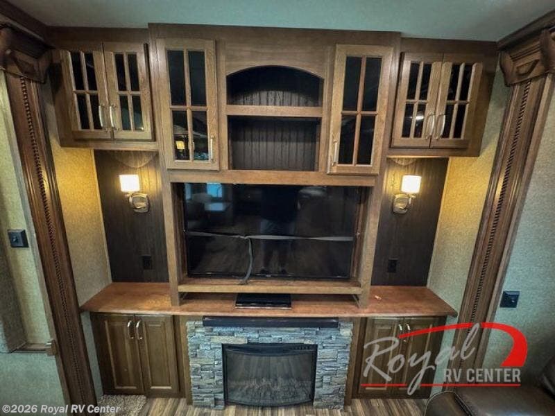 The rear wall features a full entertainment center with a fireplace, overhead cabinets and base cabinet storage. Not to mention the huge LED TV!