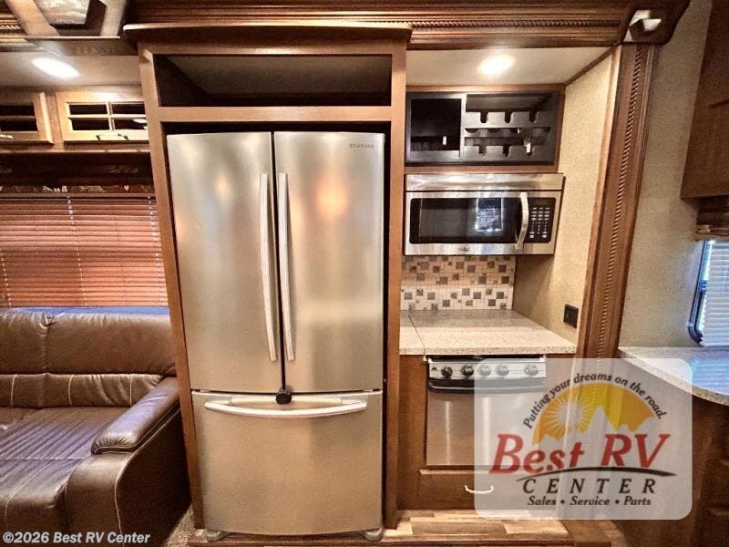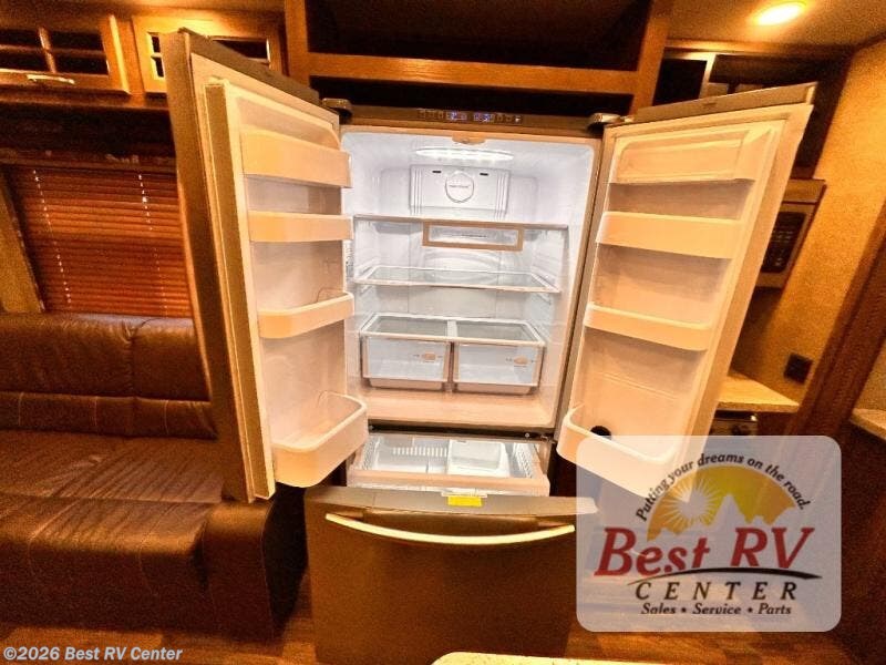 This rear entertainment Keystone Alpine fifth wheel 3011RE is identical to 3010RE in its layout which features triple slides, a king size bed, and a convenient kitchen island. The only difference is that this unit features an 18 cu. ft. residential refrigerator!