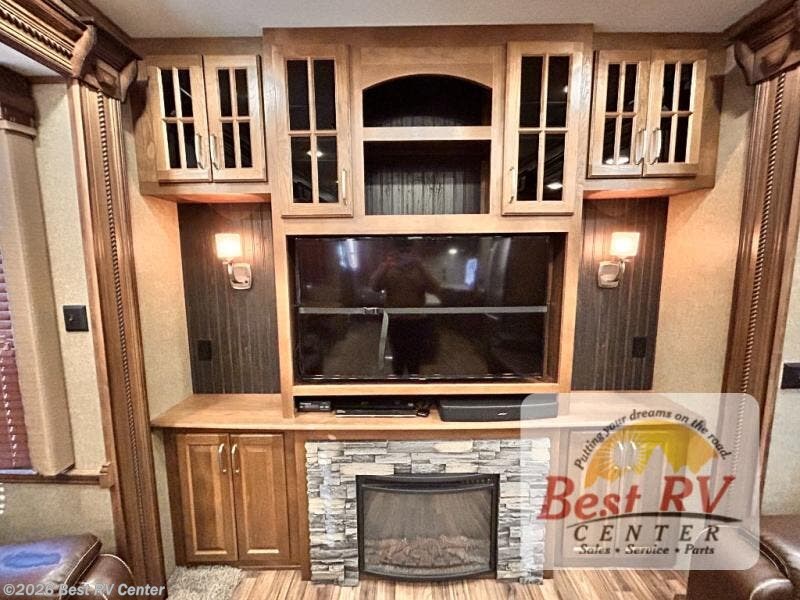 The rear wall features a full entertainment center with a fireplace, overhead cabinets and base cabinet storage. Not to mention the huge LED TV!