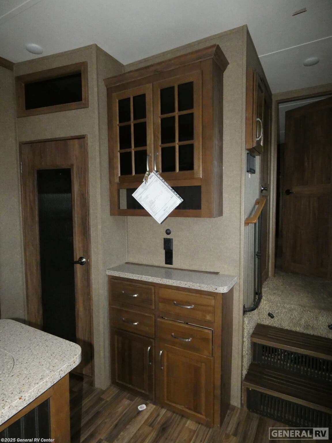This rear living Alpine fifth wheel model 3100RL features triple slides, a king size bed, and a convenient kitchen island, plus so much more! As you enter notice the kitchen area straight ahead. There is a curio cabinet with overhead storage and a pantry along the interior living room wall. The slide opposite the door provides a three burner range, 12 cu. ft. refrigerator, and ends in the living area with a tri-fold sofa sleeper including storage above. The double kitchen sink is found in a convenient island that also provides added prep space. Just inside the door to your left there is a small pantry for more storage needs. Next, a slide out which features a corner entertainment center with fireplace. Along the rear wall of this Alpine unit enjoy more seating with two recliners and full width overhead cabinets to help keep things neatly tucked away and organized. Back through to the entry head up the steps to the front side aisle bath and private retreat! The bath features a hall entry door and a second sliding door that leads right into the bedroom for added convenience. Inside the bath there is a linen cabinet, toilet, sink, and shower. The private bedroom can be accessed from the hall or from inside the bathroom. Notice a chest of drawers with a space for a TV above along the curb side wall. There is a king bed slide out opposite which gives you added foot traffic space. The front wall offers more storage for your clothing with a large closet including sliding doors. There is also a second closet in the corner that has been prepped for a washer and dryer if you choose to add, that also features some drawer space, plus so much more!