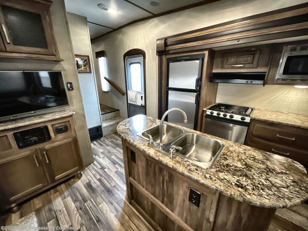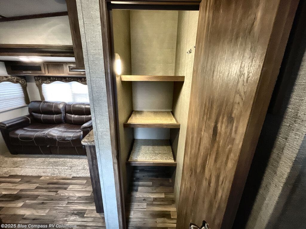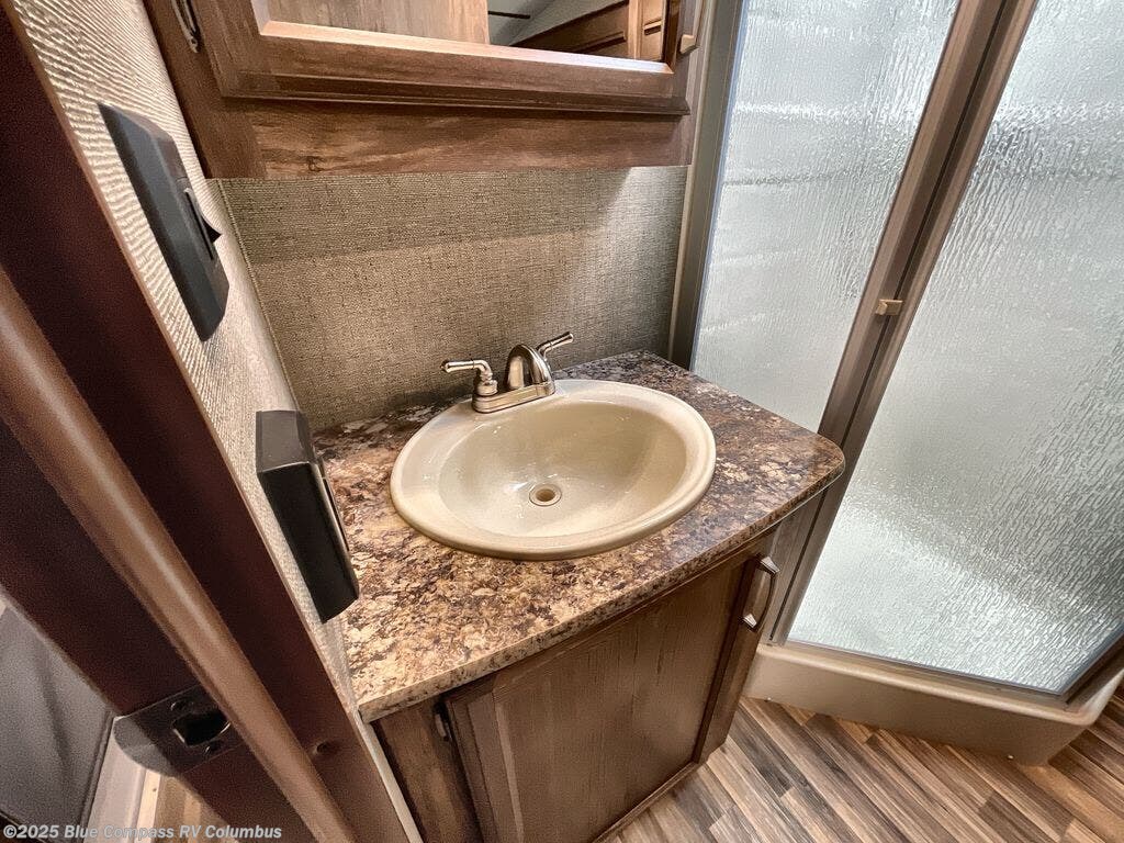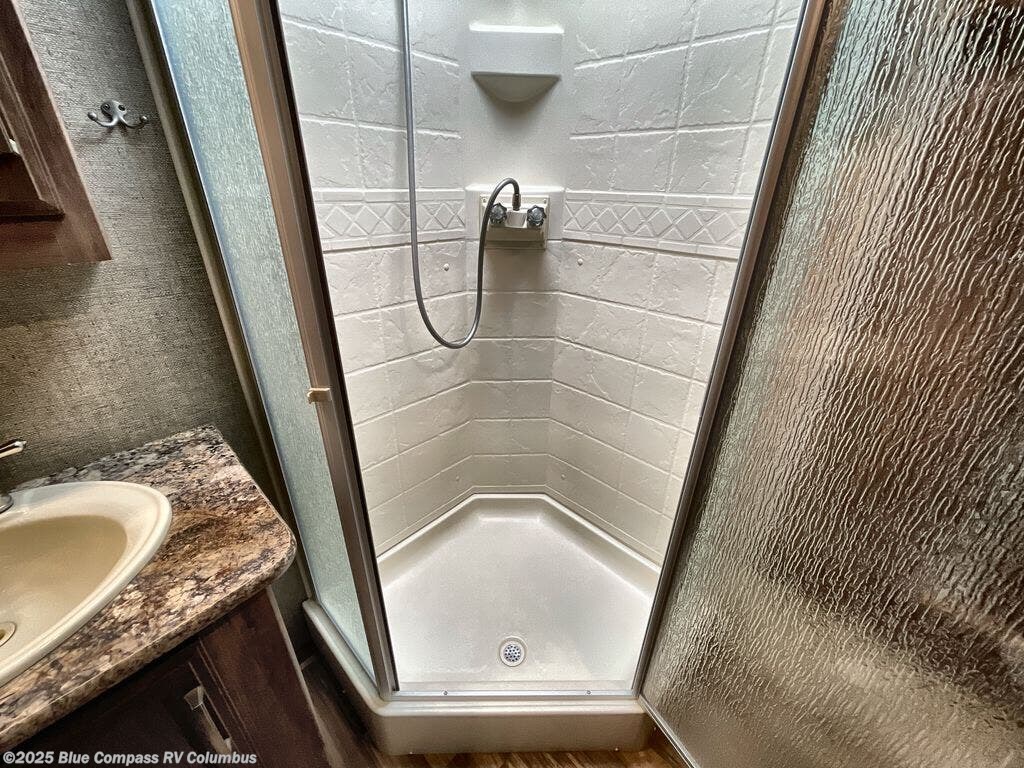 Heading towards the front of the fifth wheel, take one step up to the side aisle bath on your left. There is a neo-angle shower, sink, toilet, and linen cabinet that is part of the wardrobe slide in the bedroom, plus a second entry into the bedroom from the bath.