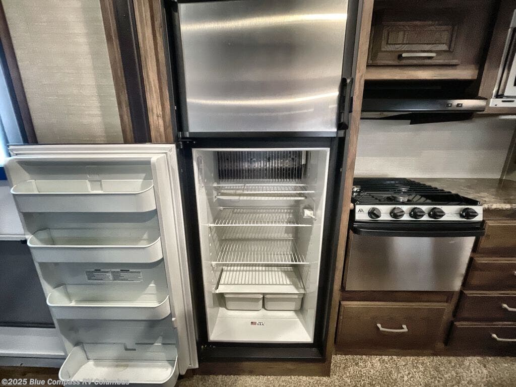 Straight in from the entry door find a walk-in pantry that you are sure to love storing your non-perishables plus some. To the left of the entry door you will find the kitchen amenities. There is a refrigerator, three burner range, countertop space, and overhead cabinets within the slide. You will enjoy the kitchen island with a large single sink when it is time to clean up the dishes.