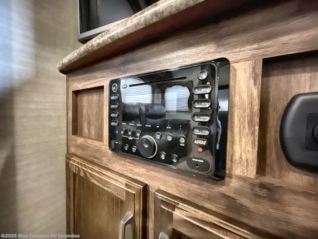 The bedroom features a queen size bed with a nightstand and wardrobe. There is also an overhead cabinet for keeping things organized. There is a TV when you want to relax and watch your favorite shows. You will also find a slide out wardrobe/linen cabinet on the road side wall making more floor space in this master bedroom.