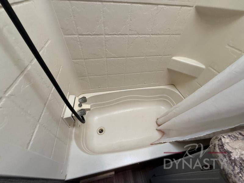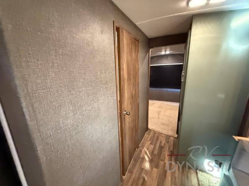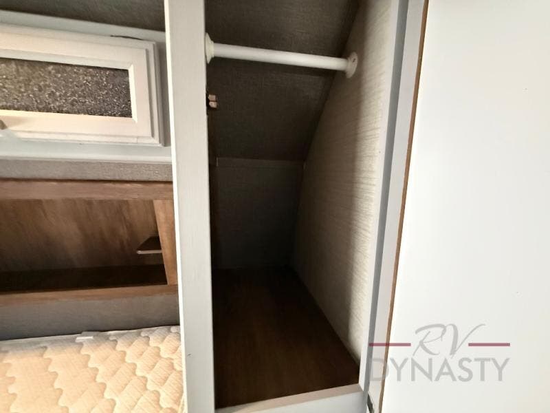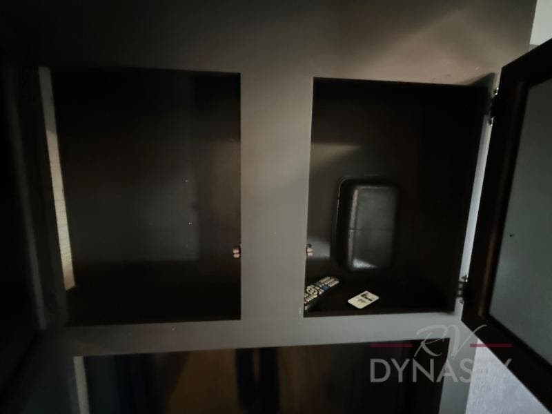 Step inside model 32ROB and find an entertainment center straight ahead along the interior living room wall. A sliding door to your right takes you into the front bedroom which features a queen bed, dual bedside wardrobes, and a convenient laundry chute. There is also an overhead cabinet to keep things organized.