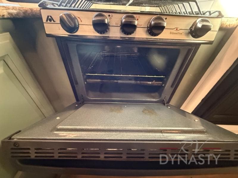 A slide out booth dinette and hide-a-bed sofa with storage above are along the curb side. This slide adds a lot of extra foot traffic space in the living and kitchen area to enjoy. On the opposite wall is the kitchen featuring an L-shaped counter with double sink, three burner range, and a refrigerator.