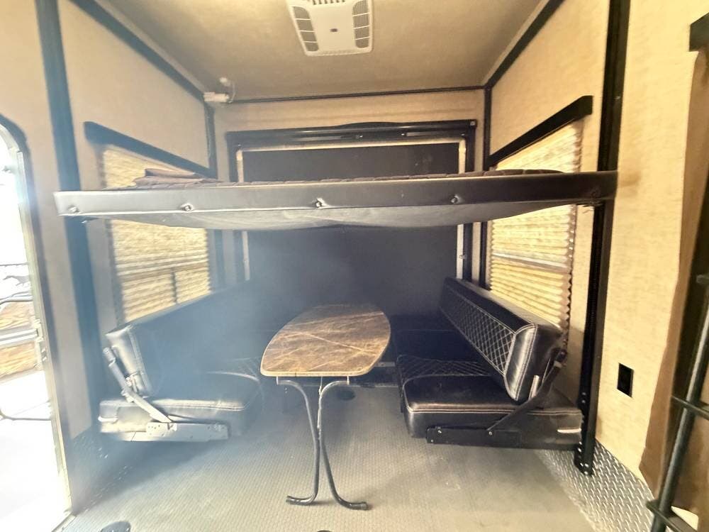 The living space is comfortable and set up with seating and an entertainment area, making it easy to relax after a day of riding.