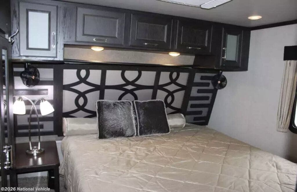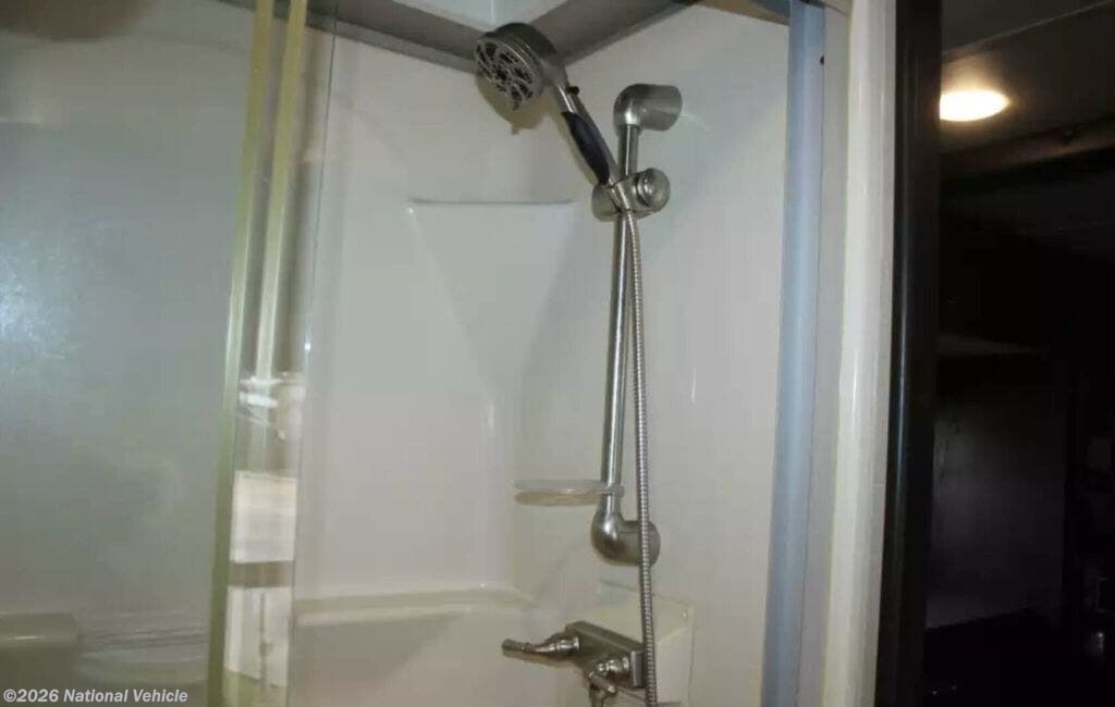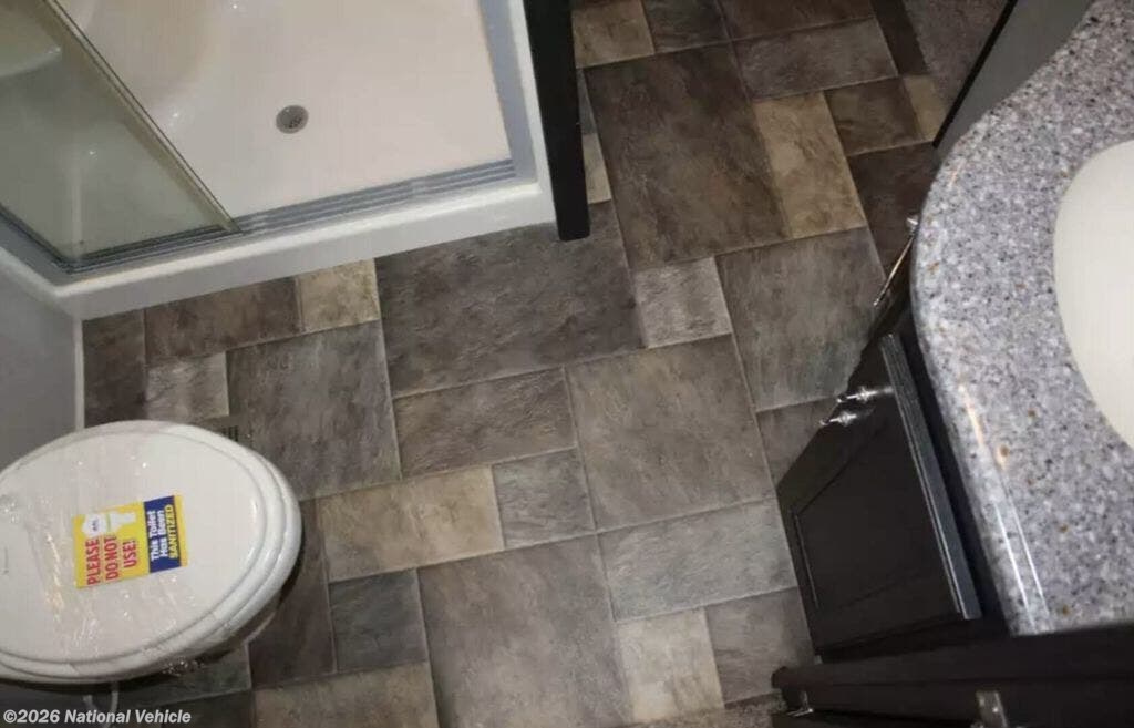 Up front, the master suite is pure comfort. A walk-around king bed, wardrobe slide, dresser storage, and direct access to the full bath create a true retreat. The bathroom features a residential shower with glass enclosure, porcelain toilet, vanity with solid surface top, and plenty of room to move ? no cramped corners here.