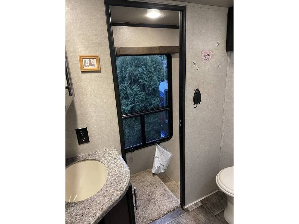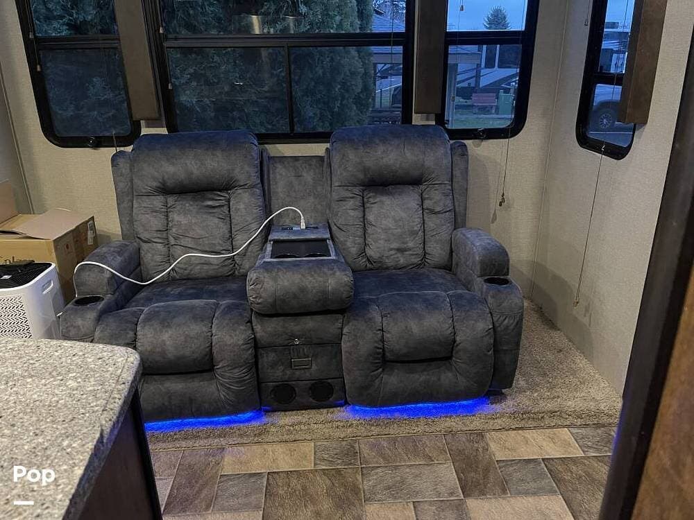 This toy hauler features a spacious living area with a sofa, overhead storage, and direct access to the patio. Climate control and natural light make the space functional and comfortable for everyday use.