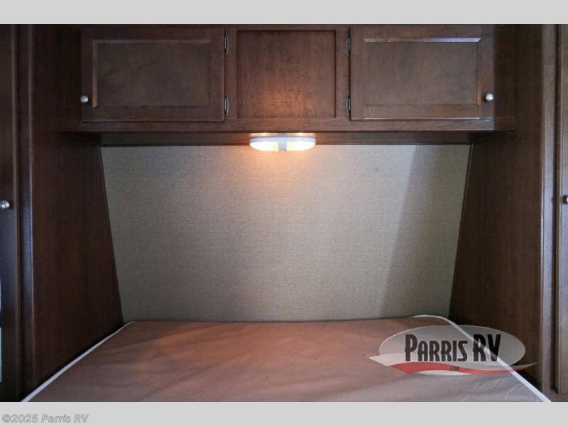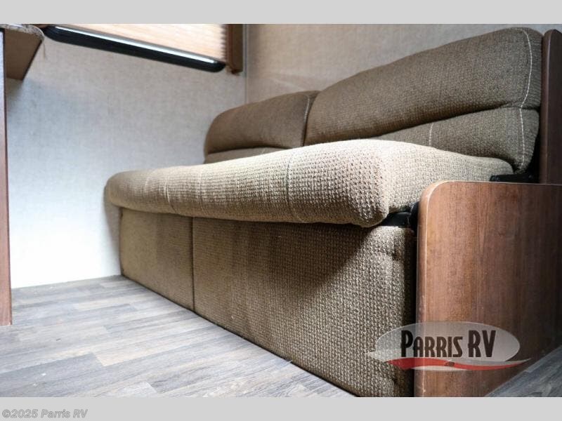 Step inside model 27RBWE and find a sofa sleeper straight ahead across the width of the room with an overhead cabinet above along the far wall.