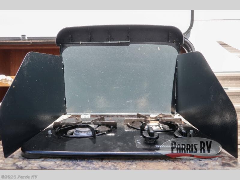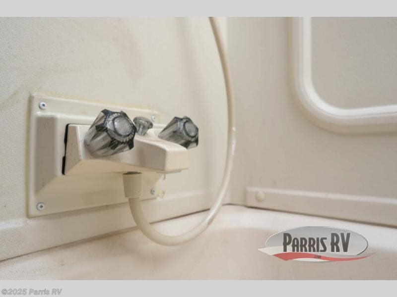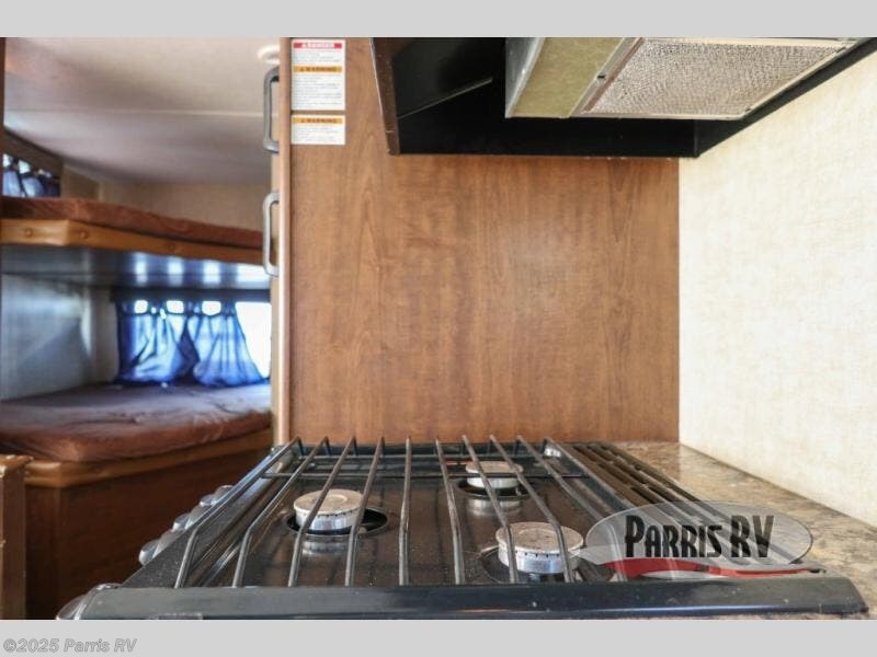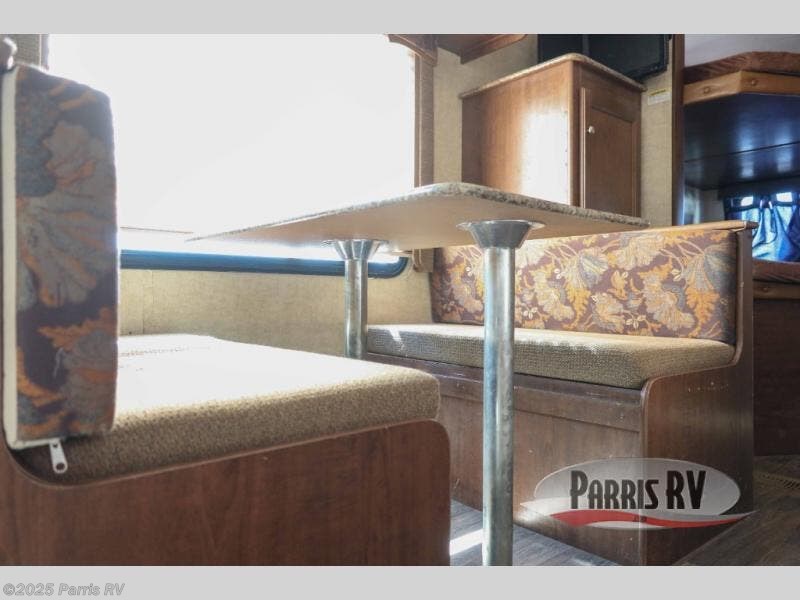 The kitchen area features a refrigerator, a three burner range, and double kitchen sink, plus overhead cabinets for dishes and things. There is a booth dinette to enjoy your meals at along the curb side wall opposite to the left of the entry door. This can easily be made into an additional sleeping space if needed at night.