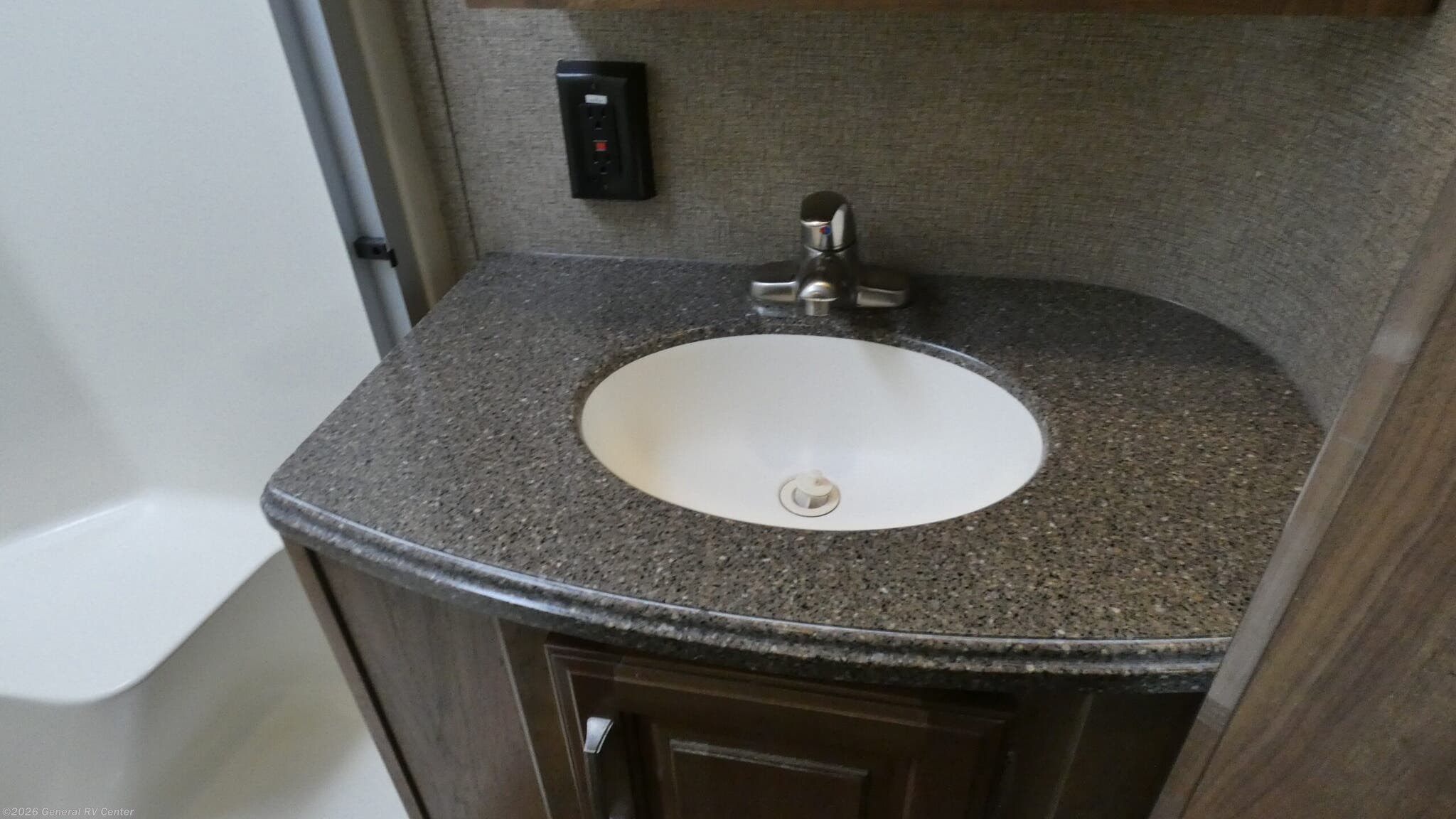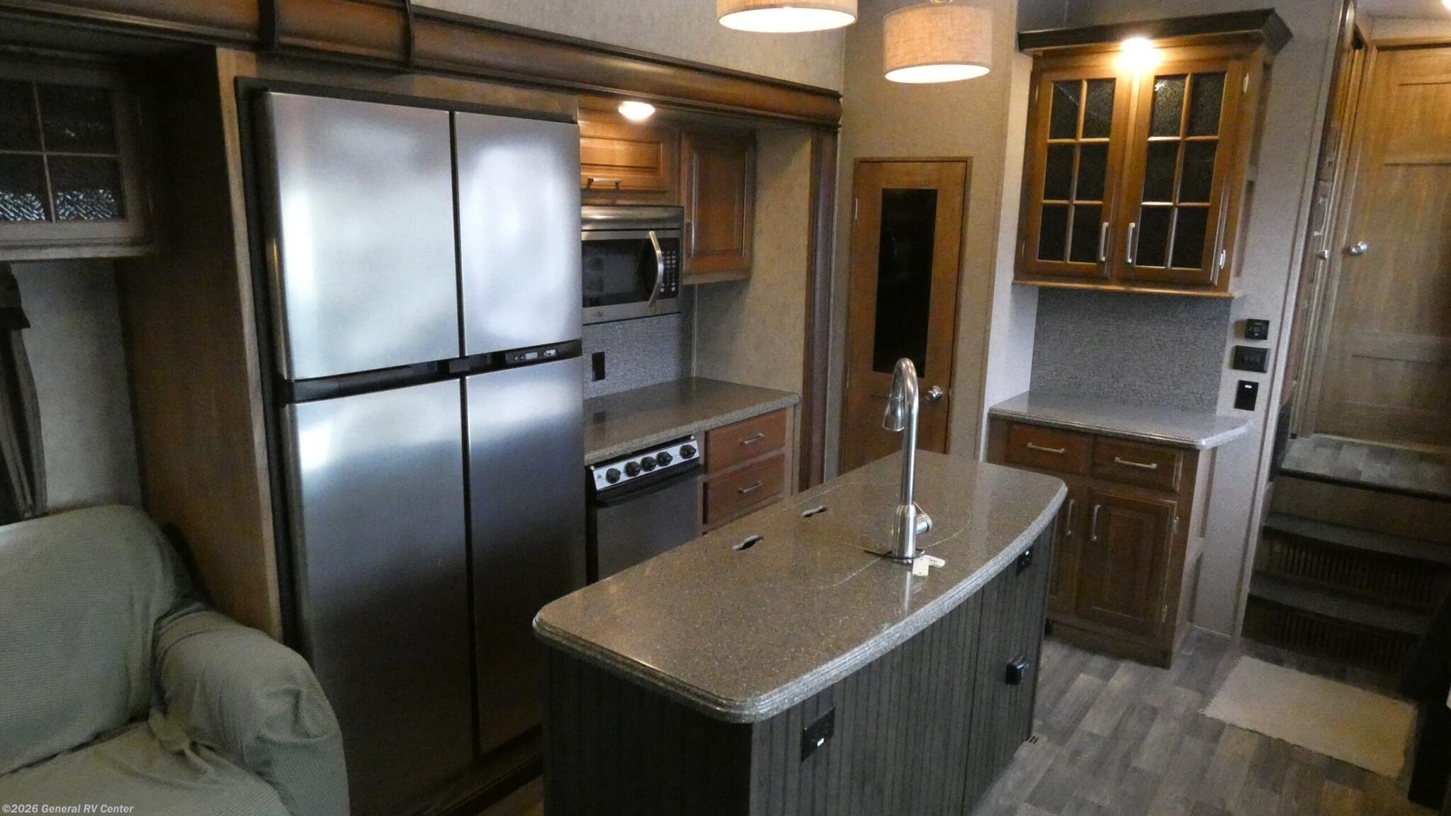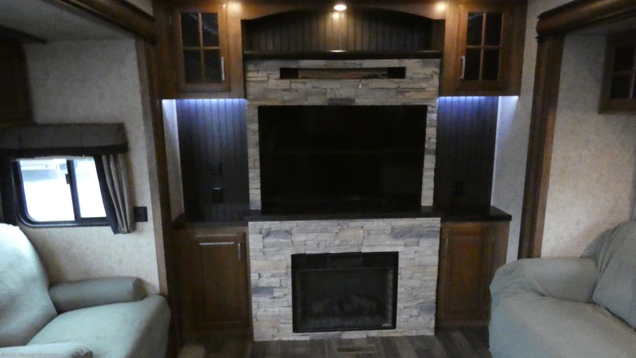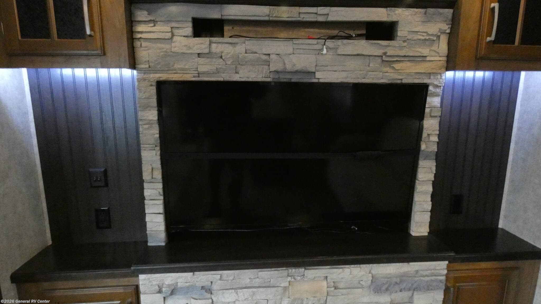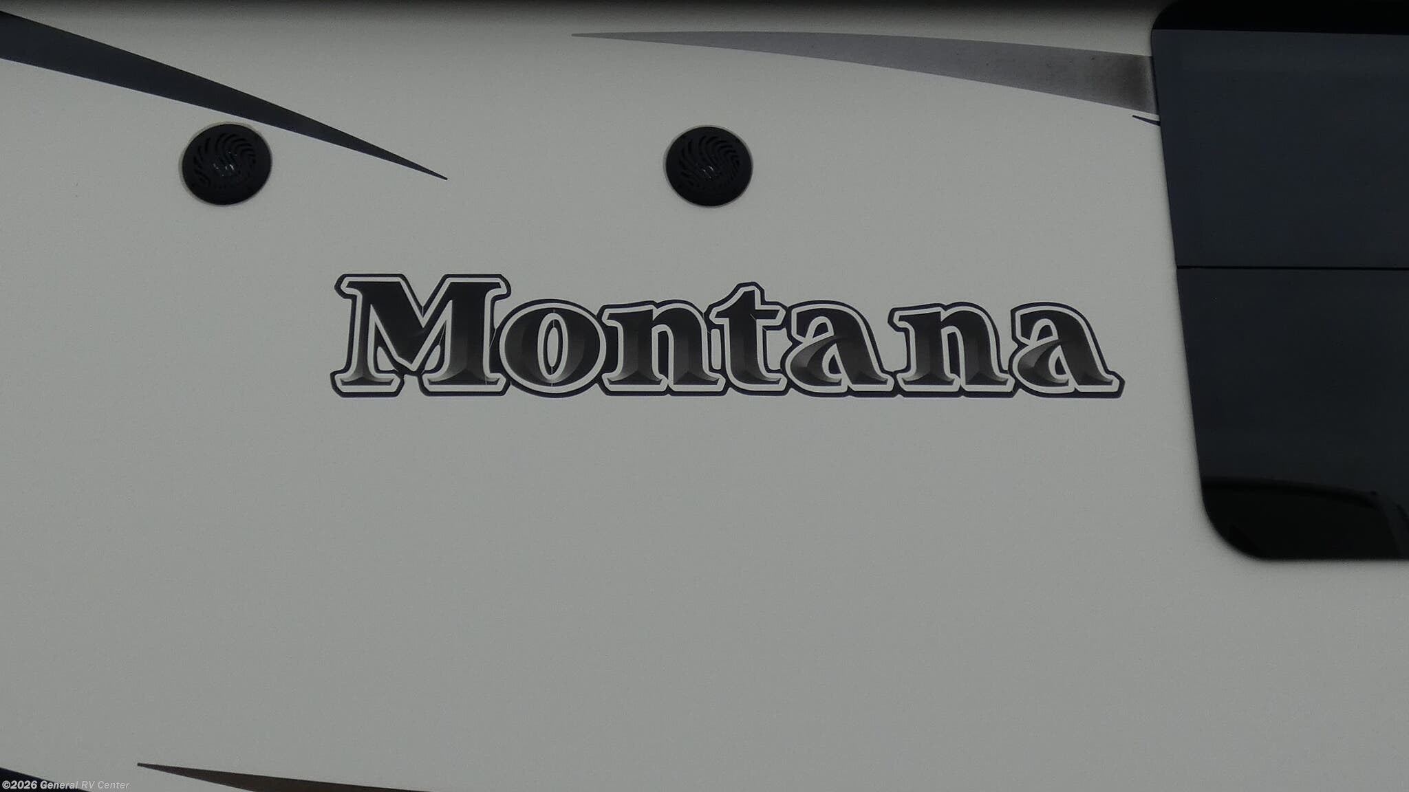 This Keystone Montana fifth wheel 3000 RE offers plenty of living space with triple slides, along with a rear entertainment area including dual opposing slides, plus so much more! Step inside and be greeted by a wide open interior with a combined kitchen and living area. There is a slide out dining table for two, and seating to the left of the door. There is also storage above the sofa for your things. Opposite find a slide out sofa, refrigerator, convection microwave oven and three burner range. There is also counter space and additional storage. A nice pantry is adjacent along the interior wall straight in from the door which includes additional cabinet space both above and below. A convenient island is available in the center of the room and features double sinks for easy cleanup. Along the rear wall of the living area you will find a full wall entertainment center and storage. There is a flat screen TV to enjoy and an electric fireplace for those cool nights when you just want to hang out inside. Step up the steps to the right of the main entry and find a side aisle bath on your left. There is a toilet, linen cabinet, 48" x 30" shower, and vanity with sink. Through the door at the head of the hall leads into a spacious master bedroom in front. Here you can relax and unwind from a full day of adventure. Sleep comfortably on a king bed slide out. There is a dresser opposite with overhead HD TV plus a seating area. The front features a full wall wardrobe, and so much more!