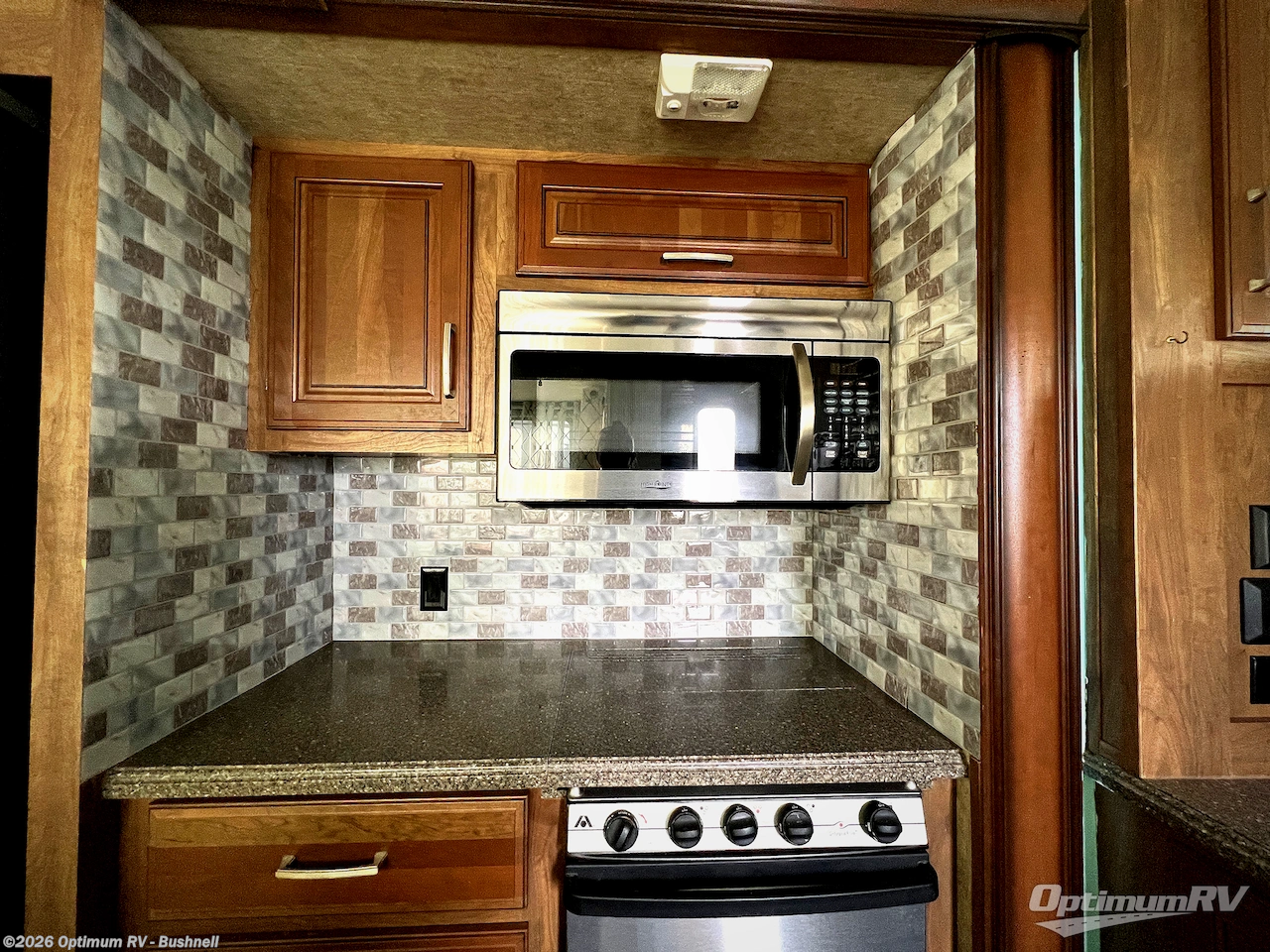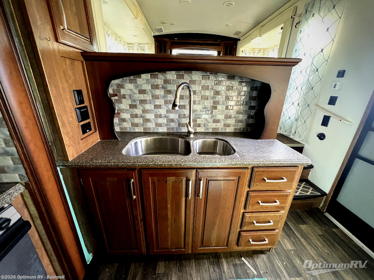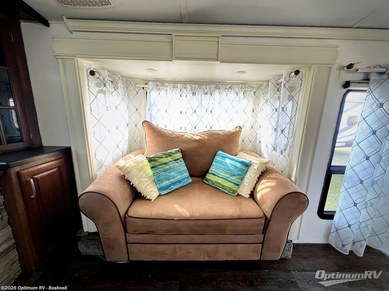 In front to the right of the main entry door head up the steps to a spacious front living area where you will find dual opposing slides. There is a slide out hide-a-bed to the right, and an L-shaped hide-a-bed sofa with connected recliner to the left. Along the front wall find a HDTV, and optional fireplace, plus so much more!