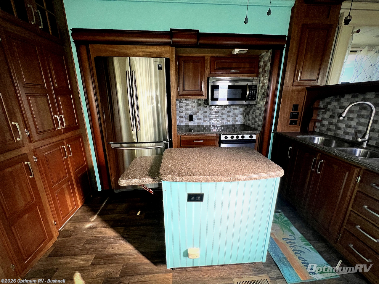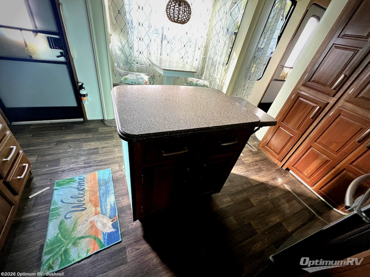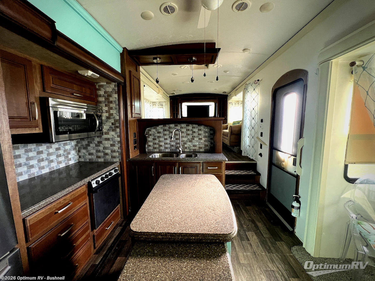 Step inside the centrally located entry door and find yourself in this 3711FL kitchen with dual opposing slides. There is a slide out for the dining table with two chairs to the left of the door. Straight ahead is a counter with double sink, and the slide opposite the door offers a three burner range, counter area, and 18 cu. ft. residential refrigerator. There is a small pantry just off the appliance slide, and a space prepped for a washer and dryer if you choose to add. You will also enjoy the convenient kitchen island which provides added food prep space and more.