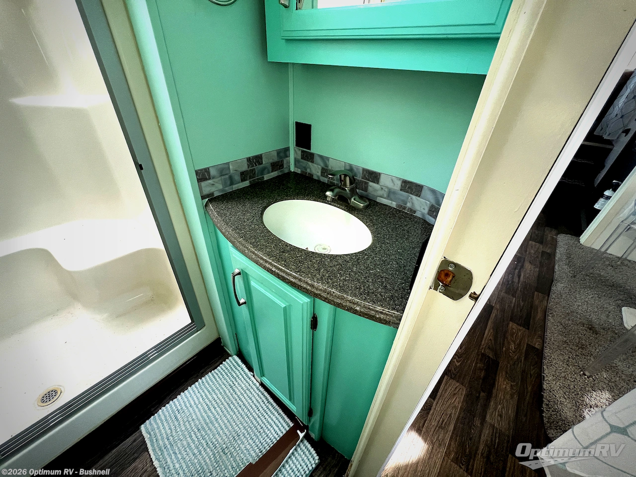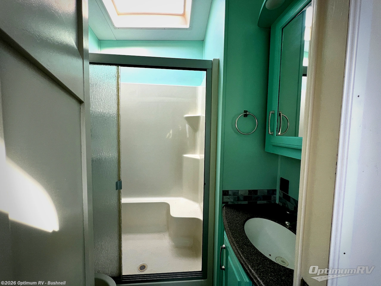 Head toward the rear of this unit and find a complete bath with sink, toilet, and a 48" x 30" shower, plus linen storage. There is also a second outdoor entry right across the hall from the bathroom door which makes it convenient to access when enjoying time outside making it a quick step in to use.