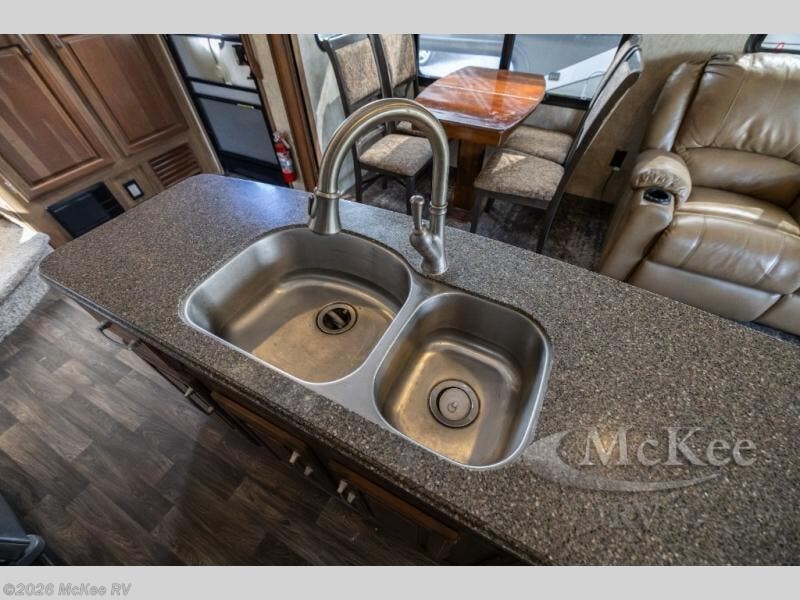 A second slide is found opposite the door and begins with an entertainment center including a HD TV and fireplace adjacent to the sofa. Next, you will find a pantry, counter space, a three burner range, and 18 cu. ft. residential refrigerator slide out. A convenient island offers additional counter space and storage, plus it is the location of a double kitchen sink.
