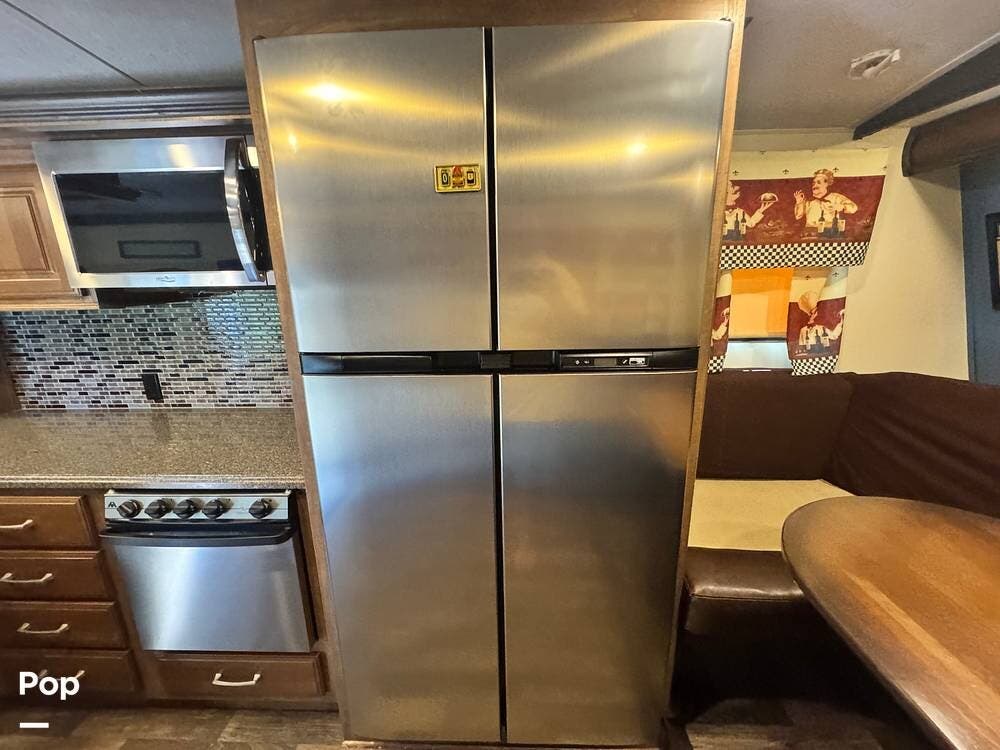 The kitchen features a 4-door refrigerator/freezer, a residential-style oven, a covered stovetop range, a microwave, a double sink, and a U-shaped dinette.