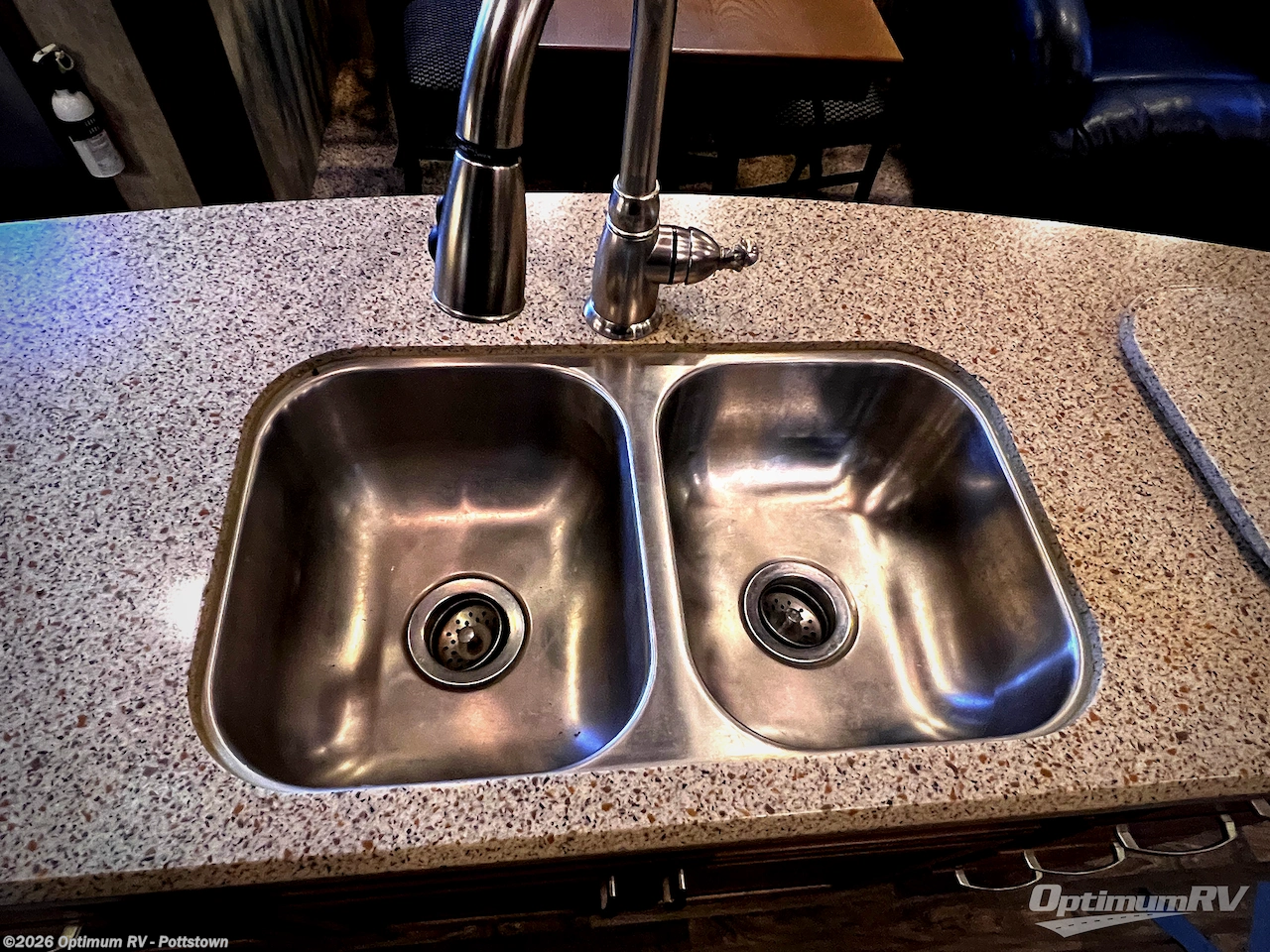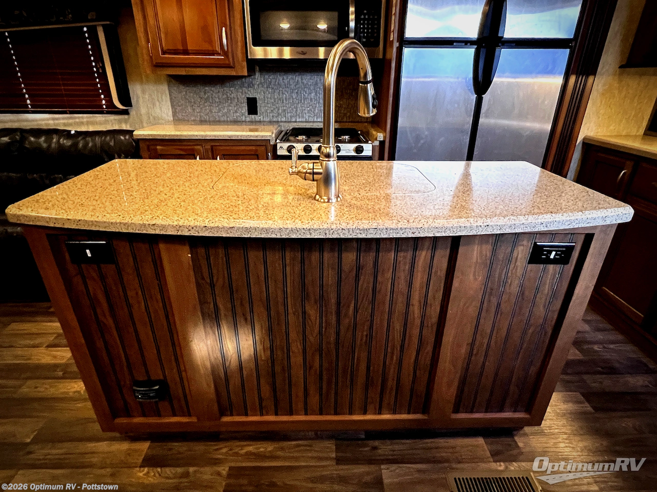 The slide out opposite the door side features a hide-a-bed sofa, counter space, three burner range with overhead microwave, and refrigerator. There is also a convenient hutch along the interior wall, and a kitchen island that offers more food prep space and a double sink making clean up a cinch.