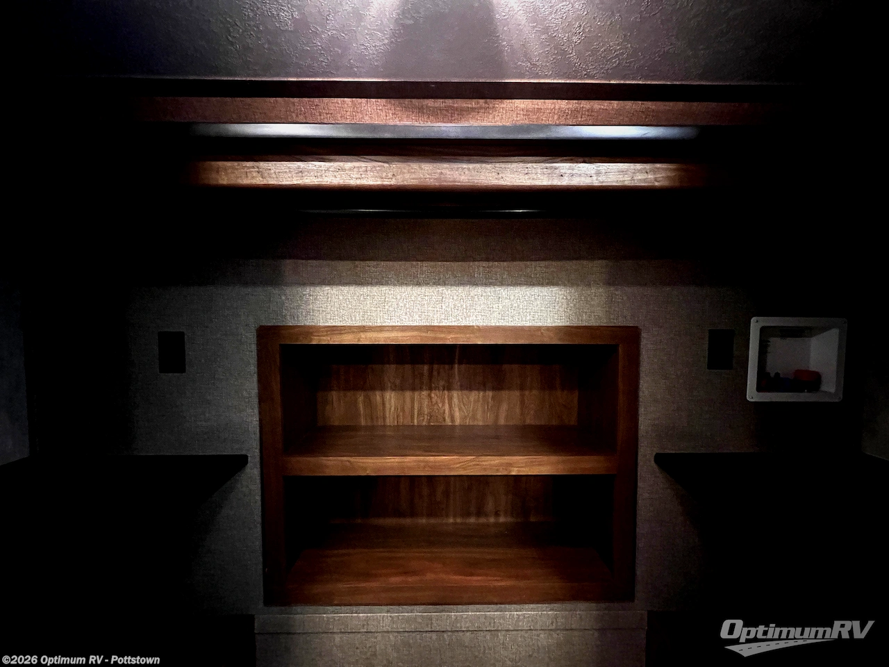 The master bedroom at the front of this Montana High Country unit offers a slide out queen or optional king bed both with underneath storage for larger items like luggage or extra blankets. There is more storage found opposite the bed in the dresser, plus there is an HDTV above, and seating along side of it. The front wall features a wardrobe between washer and dryer prepped spaces, plus so much more!