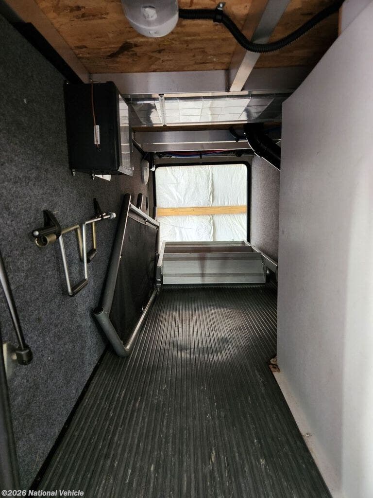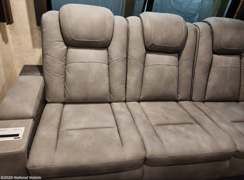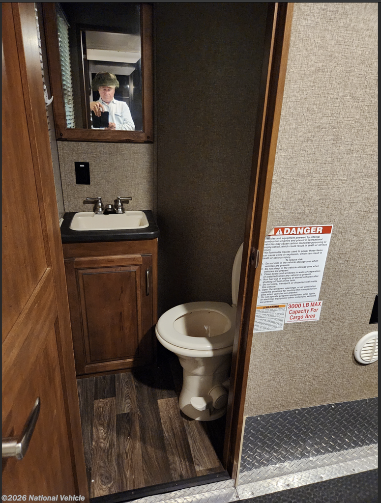 Loading and unloading will be a breeze with the rear ramp door. Inside find dual opposing sofas with an electric bed above that stores neatly up at the ceiling until the toys are removed. A convenient half bath is available in the cargo area, plus a side man door for easy access after the ramp door is closed.