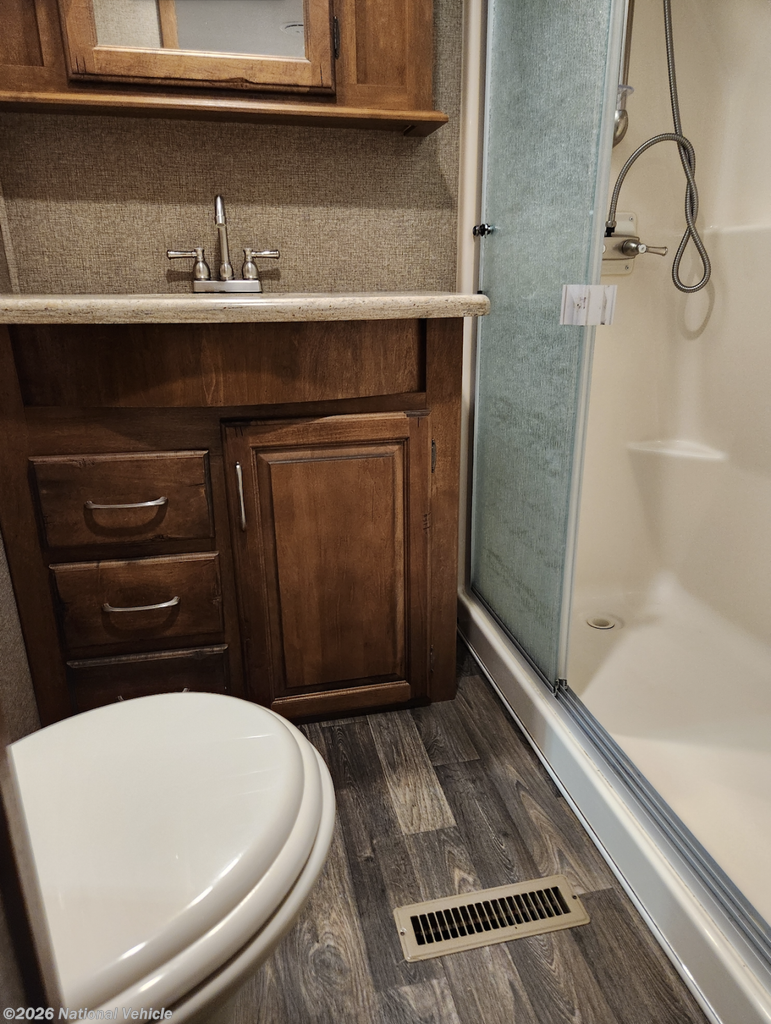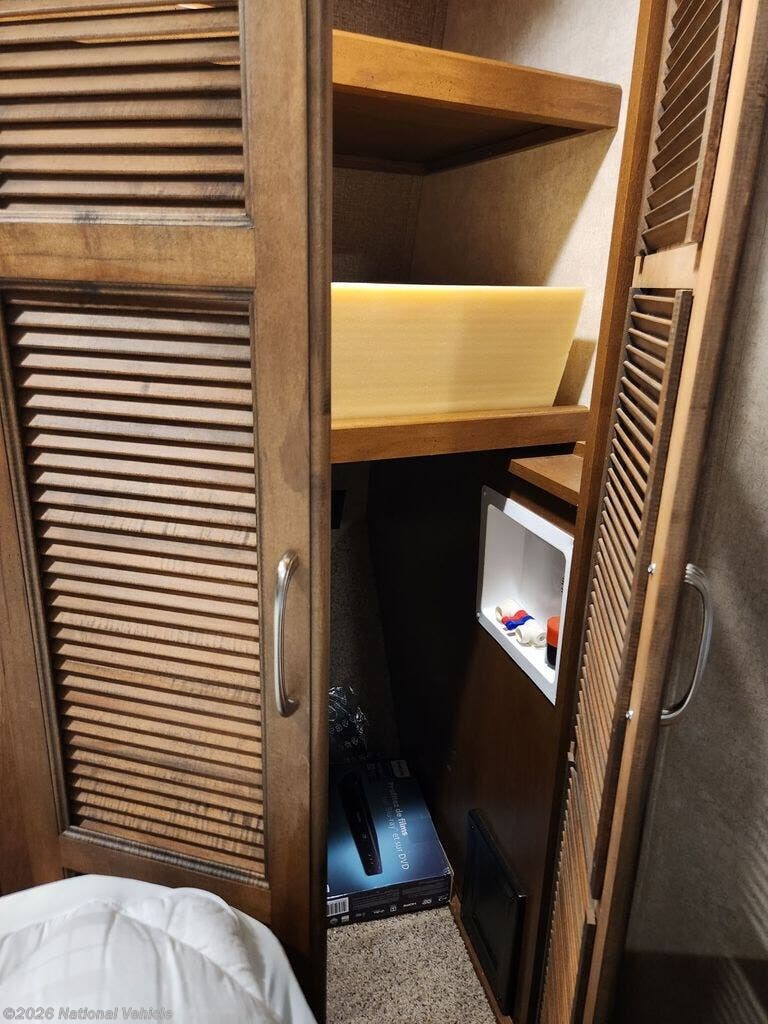 The front bedroom has a king bed slide. Across from the bed there is a dresser and entertainment center. Along the front wall of the room you have extra storage with the wardrobes, and in the corner you will find that the wardrobe has been washer/dryer prepped for your convenience.